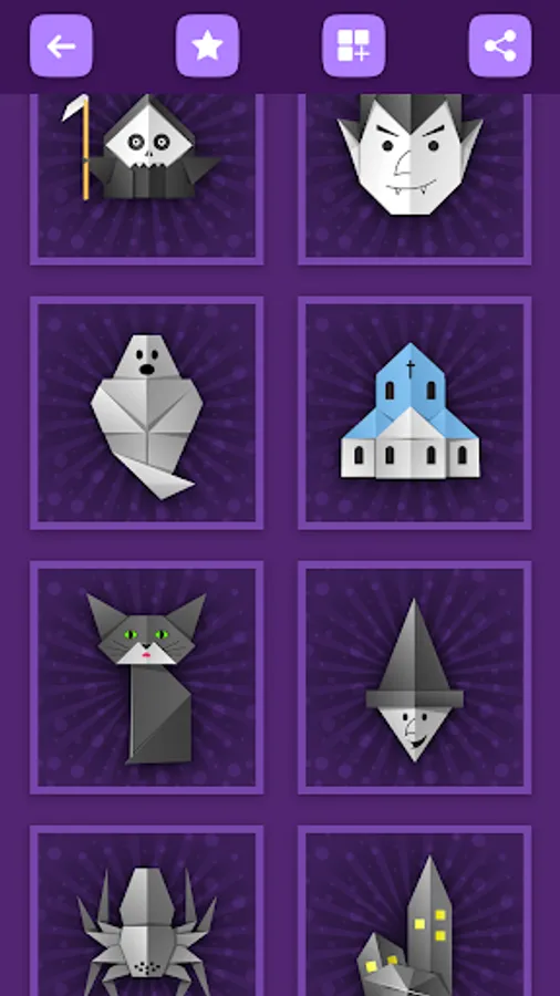 To make paper crafts for the Halloween day presented in this application, you need colored paper. But you can use plain white tissue paper, such as writing paper or office paper for a printer.Try to fold the paper as best and as accurately as possible We recommend using glue to fix the forms of crafts.This will make the process of folding origami more convenient, and crafts will be more beautiful.