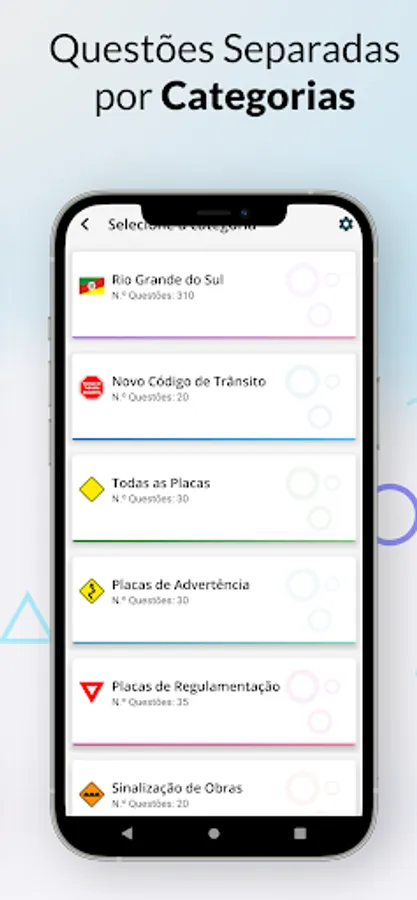 The Simulado Detran RS 2022 app contains questions from all boards, even separated into categories with Auxiliary Boards, Warning Boards, Works Signaling Boards and Regulatory Boards