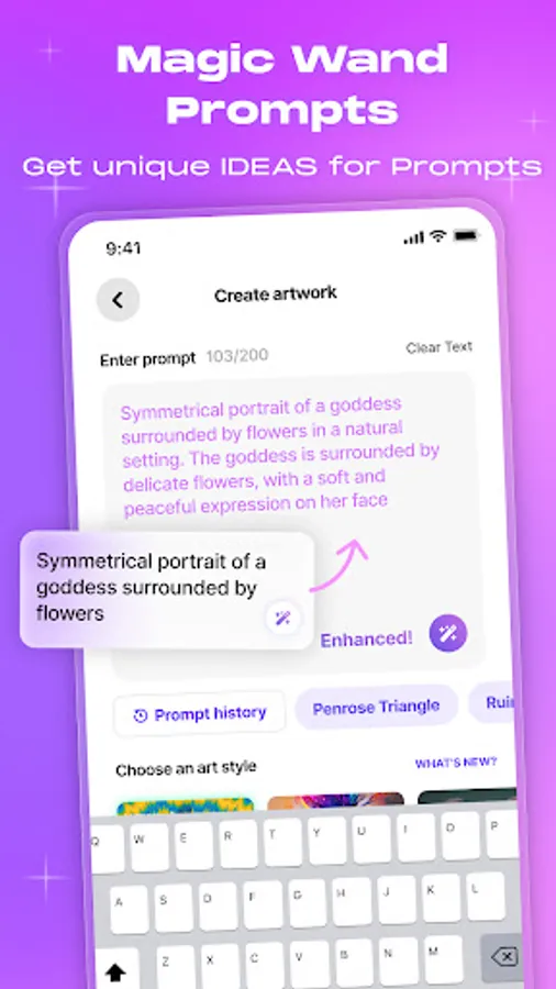 Turn words into photos & beautiful digital artworks using the power of AI! All you need to do is enter a prompt, pick an art style - and watch WOMBO Dream - AI Art Generator bring your idea to life in seconds. Do you want to create a photo, picture, drawing or painting that is your art work? WOMBO Dream - AI Art Generator is an art station for you. You can turn text into any image or photo you want.