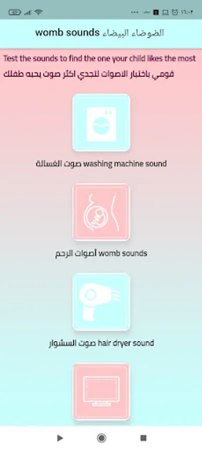 الضوضاء البيضاء او صوت بطن الام هي الاصوات التي تشبه صوت تششششششششش او اشششششششش مثل صوت الغسالة او صوت السشوار الشعر او اصوات الاحشاء داخل الرحم صوت التلفاز المفصول و هي موجودة جميعها داخل التطبيق