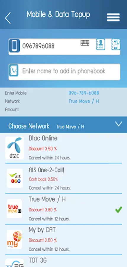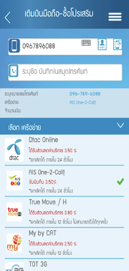 12call 3.5% discount Happy 3.5% discount Truemove 3.8% discount MyByCat 2.5% discount TOT 10% discount PENGUIN 2% discount and a variety of prepaid cards