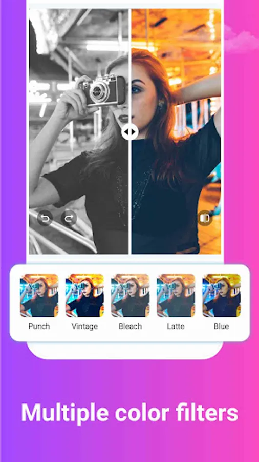 A large number of stylish filters to meet all your photo editing needs, such as Punch, Vintage, Bleach, Instant, Latte, etc.; you can also find retro filter effects such as vaporwave here. Functions such as brightness, contrast, saturation, shadow, RGB curve, sharpness and exposure adjustment are all supported to meet your various needs for high-quality photo production.