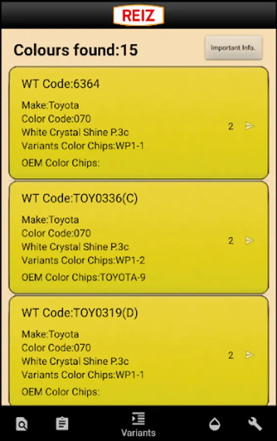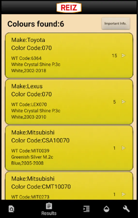Reiz Pro-Color is the newest released car color retrieval system for Reiz Toner system. The app is internet based and free to download. It works for iPhones, iPod touch and iPads. It is no longer necessary for you to check formulas from a laptop or desktop. For a laptop or desktop, after launching the program, you have to check new online updates every time. However, with Pro-Color mobile system, you have access to the most updated formula data which is synchronized to the server. All you have to do is to enter simple criteria(such as make, year, color code and so on). The app provides a perfect color match solution.