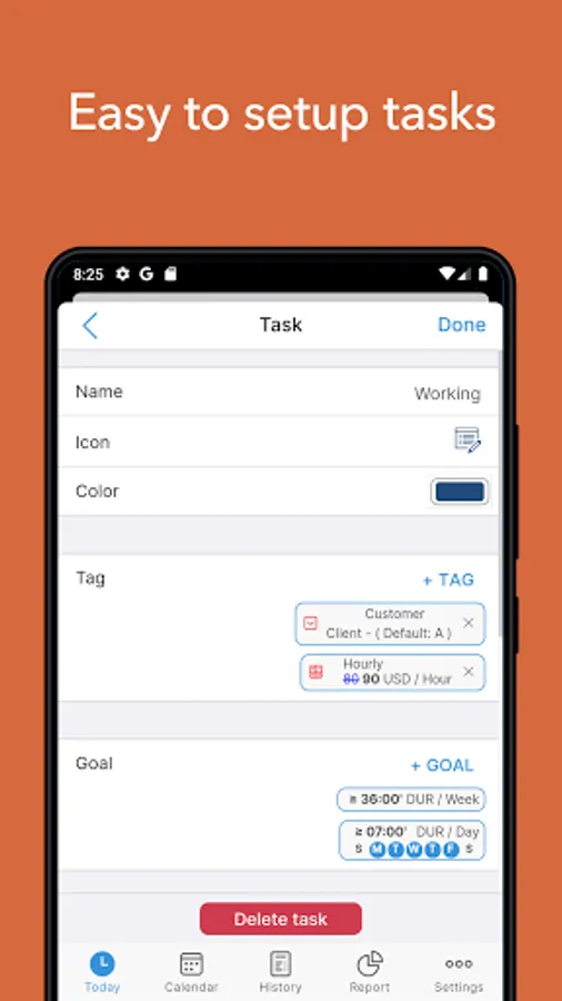 • Advanced tag system to group tasks and allow users to set values (Sum / Average / Hourly) or code for reporting.