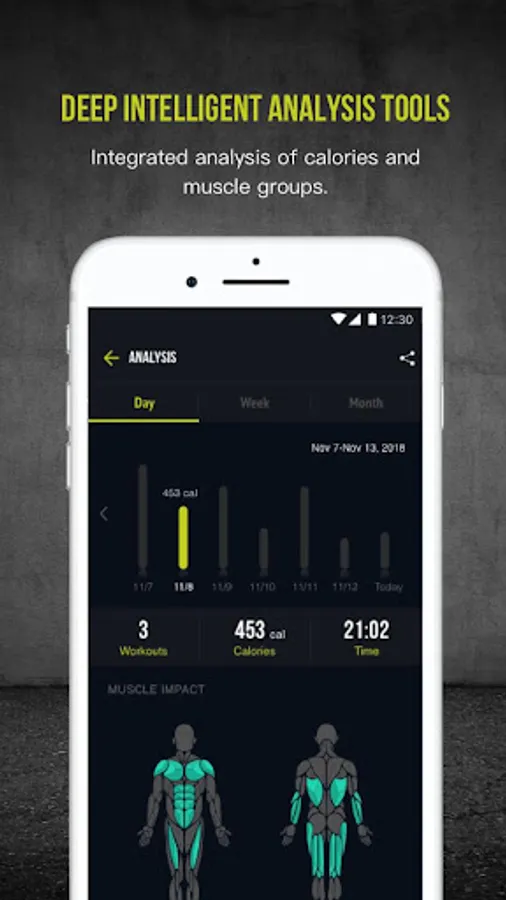 Daily, weekly, or monthly data analysis keeps statistics on calories burned and muscle groups challenged in order to examine your exercise progress.