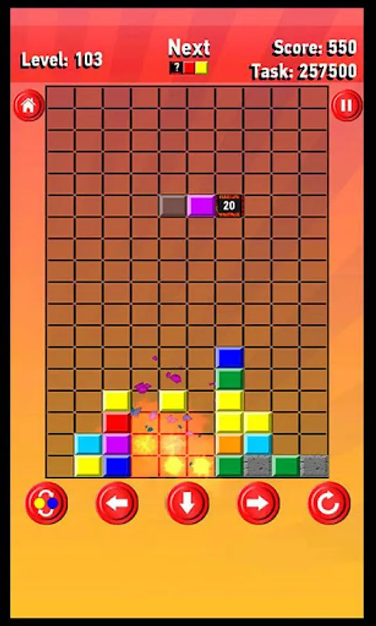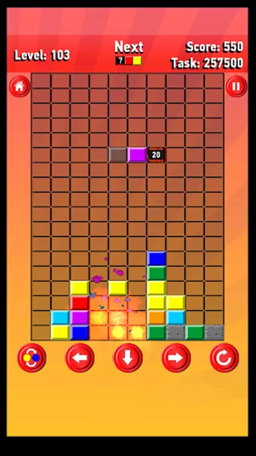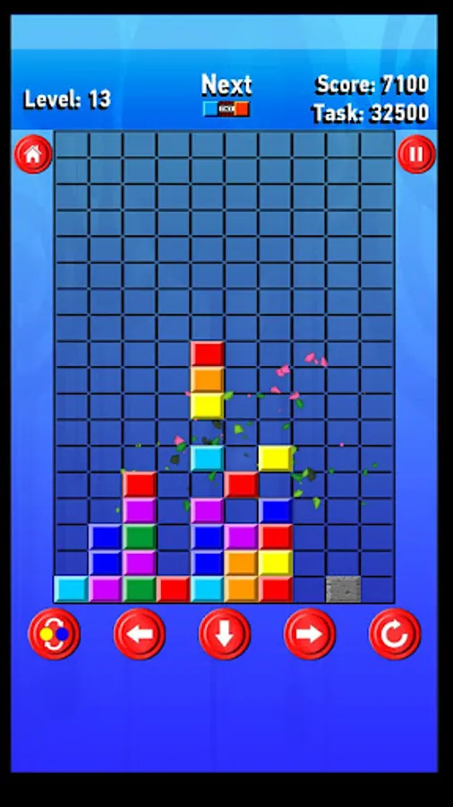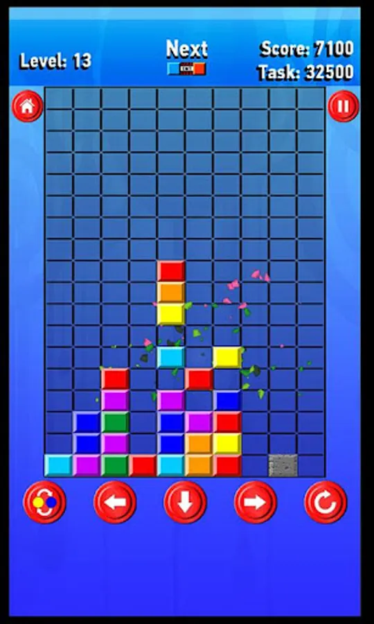 The goal of the game is to get 3 blocks in a row or column of the same color, using new blocks as they fall, and so see them explode. If the stack reaches the top before you reach the required score, it is game over. Really simple to play but hard to master.