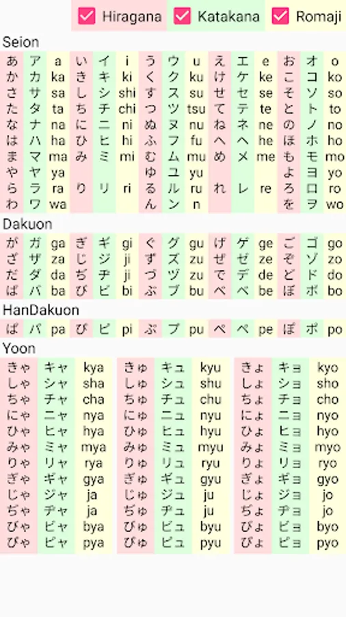 Japanese character table (Hiragana & Katakana & Rōmaji) and quiz. Let's challenge yourself!!