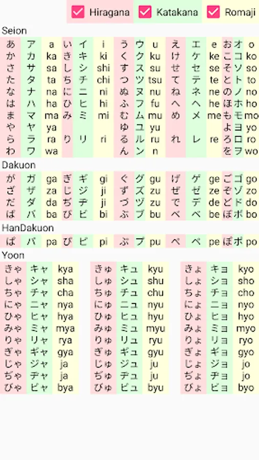 Japanese character table (Hiragana & Katakana & Rōmaji) and quiz. Let's challenge yourself!!