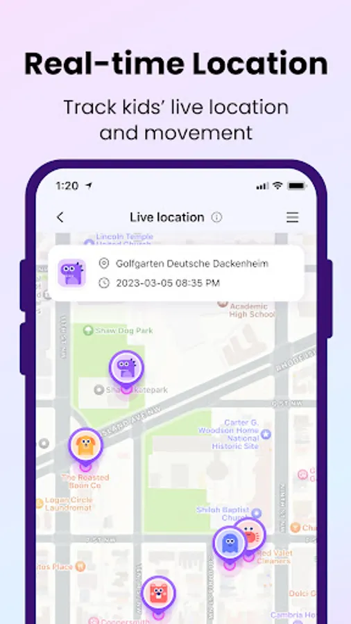 - Know current geographic location of your child in real time and confirm his/her physical safety