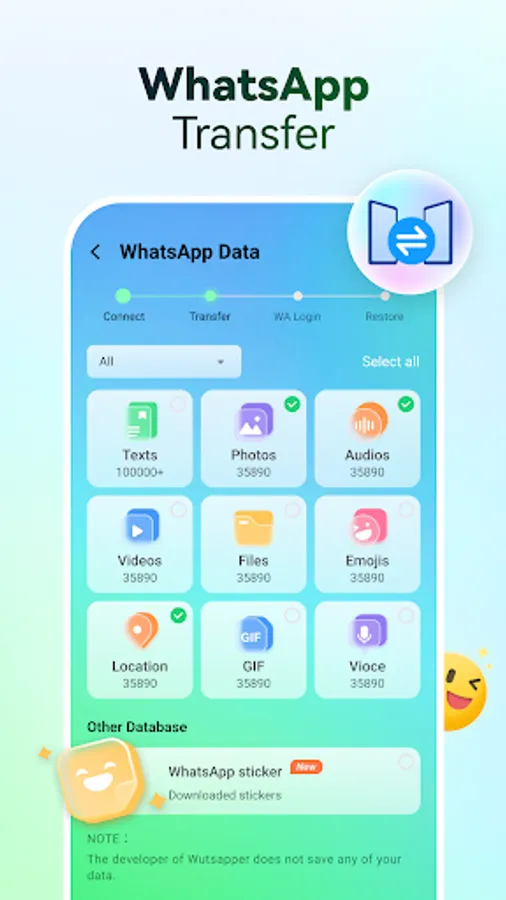 MobileTrans supports the transfer of all types of data to your new mobile phone, this includes images, videos, audio, contacts, music, docs (Word, PowerPoint, Excel, ebooks...), WhatsApp chat history, WhatsApp Business data, and calendar events.