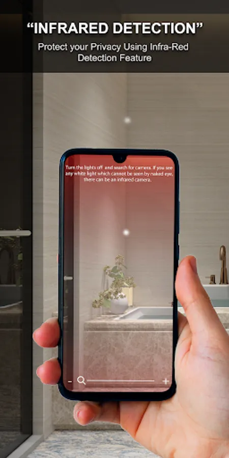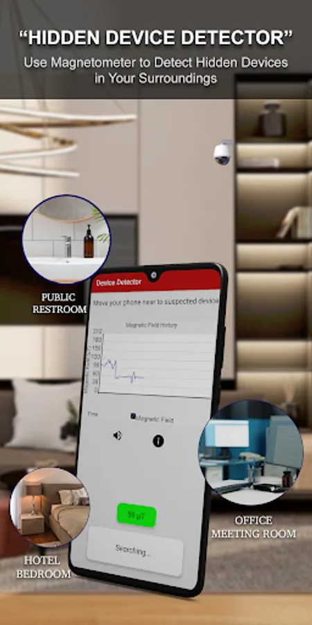 This app uses an algorithm to detect hidden devices using magnetometer readings. When the magnetic field value is higher than usual, the app alerts user to search for potential hidden electronic devices in the surroundings.