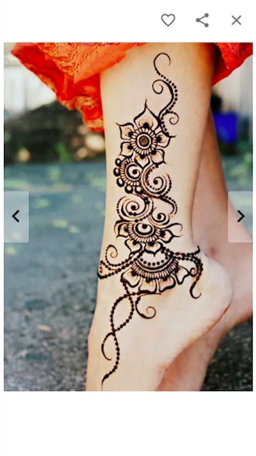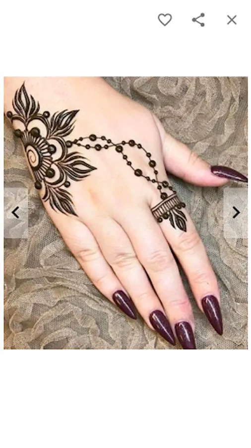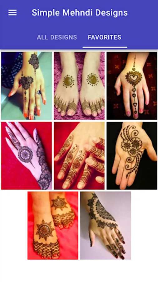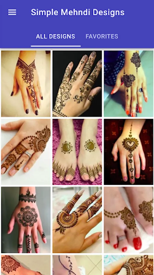 All mehndi desings in this app are available "offline". You can choose your "favorite" mehndi designs to find them quickly later. These simple mehndi designs can be "shared" with your friends and family using different social networking apps installed on your device. Each mehndi design in this app can be "zoomed in" by double tapping on it for a clear view.