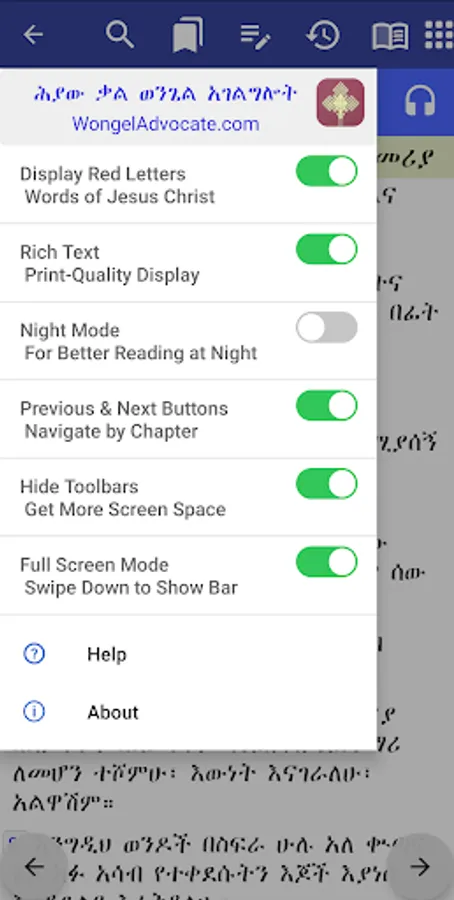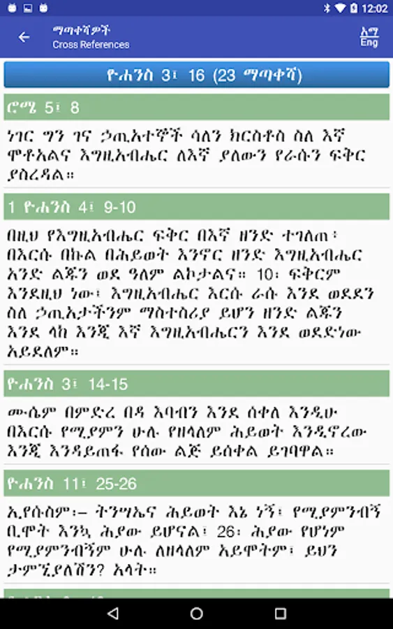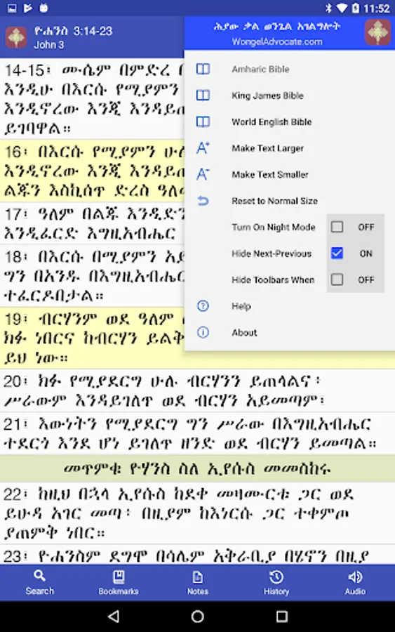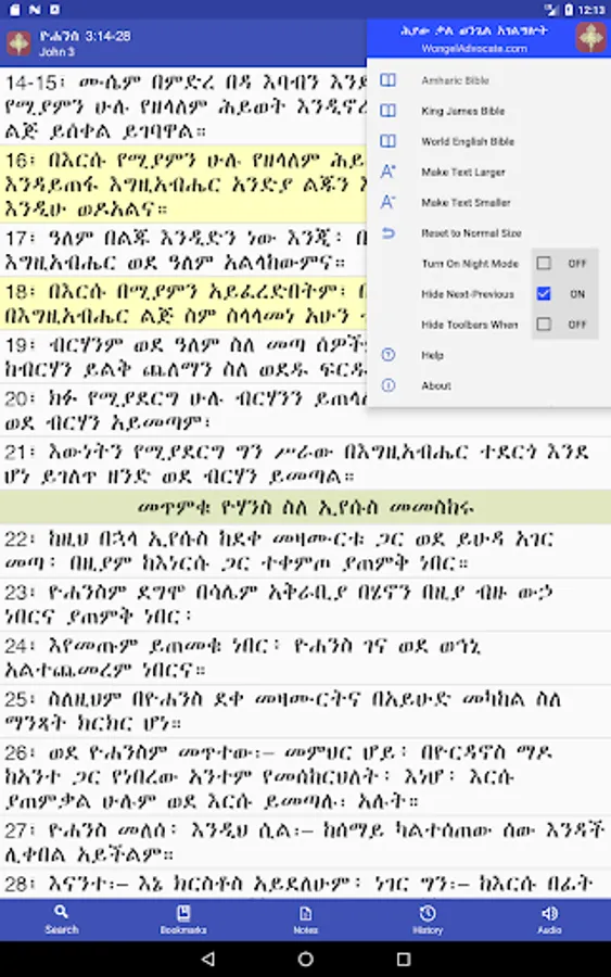 Developed by WongelAdvocate.com - we give gratitude and in honor to Ethiopian Bible Society. This app does not require Internet connection to operate once installed. It runs on all Android phones and tablets with versions 4.0.3 and higher. We are grateful for the many users who continue to encourage us and send us feedback - because of your contributions, the quality and accuracy of the app continues to improve - BLESS YOU!