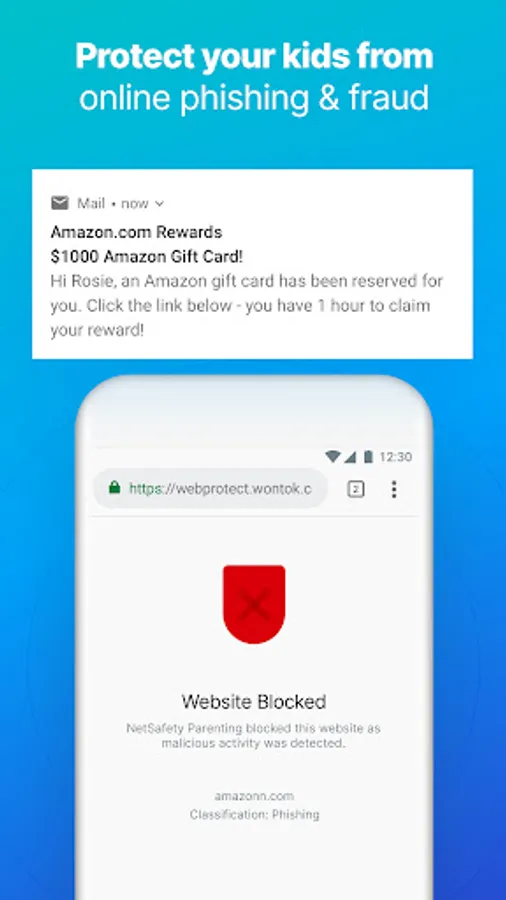Protect your child from harmful content and cybercrime with NetSafety Parenting. Simply install on their device(s) and NetSafety Parenting will both: restrict access to illegal and adult content; and block phishing, fraud and other malicious websites.