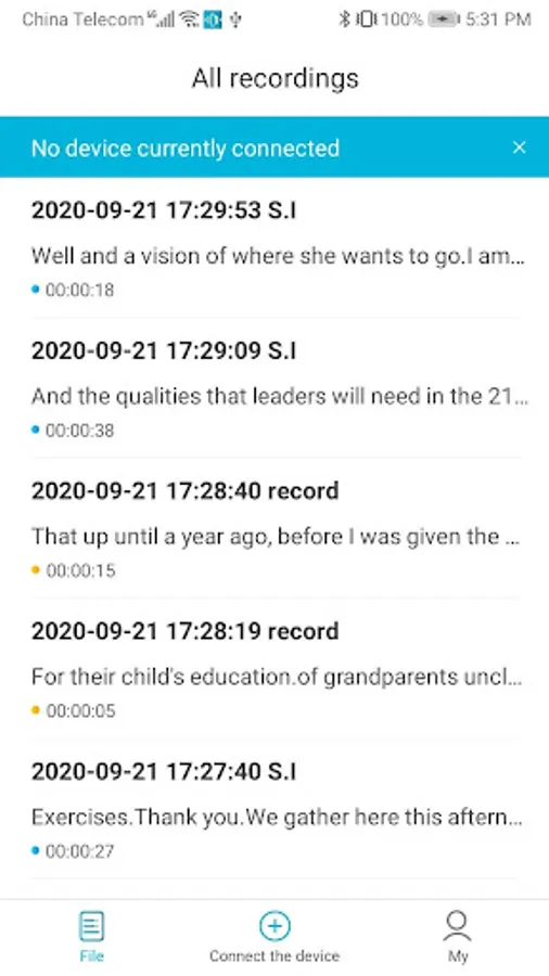 After connecting with the recording pen, you can transcribe while recording, and check the transcribing results in real time. You can also record it first and then transcribe it after the recording is over.