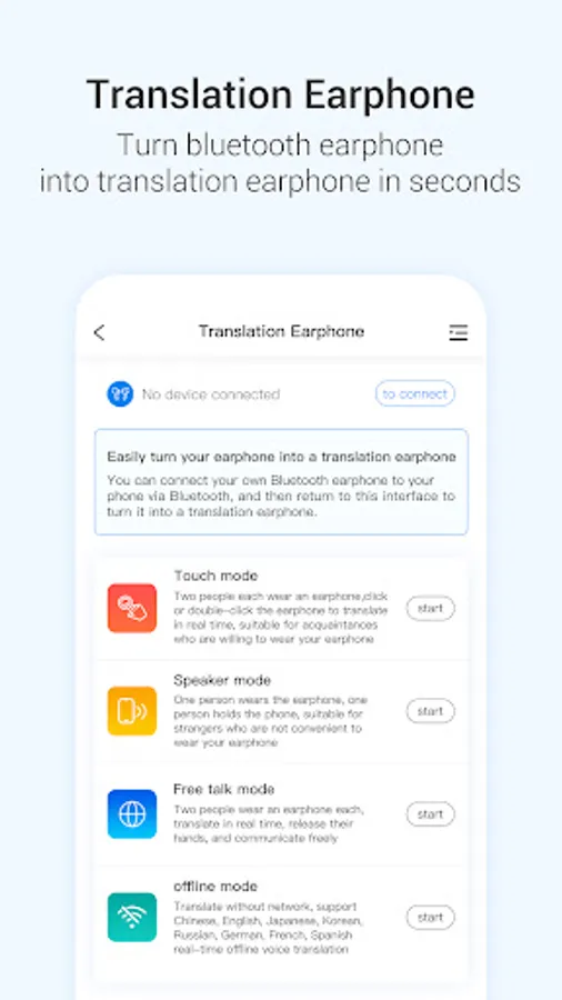 Connect your own bluetooth earphone to the phone via bluetooth, open the WOOASK APP translation earphone interface, and it can become a translation earphone in one second. When translating, each person wears a earbud, which makes the translation operation more convenient and the communication more natural, which greatly improves the user's translation experience.