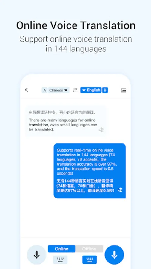 Supports real-time online voice translation in 127 languages (71 languages, 56 accents), with high translation accuracy and fast translation speed.