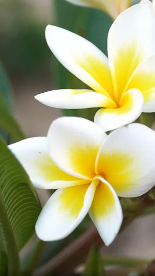 white frangipani flowers have a yellow center and five white petals arranged in a spiral. as a tropical plant, this tree grows only in warm climates or in greenhouses. elsewhere, it can be grown in a pot and brought indoors during cold seasons, but this can be challenging in many climates. decorate your phone with this blossom wallpaper.