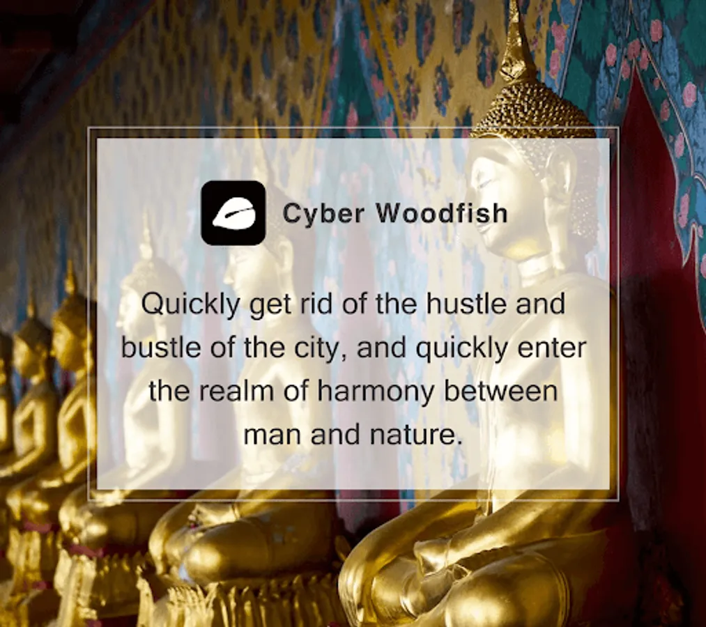 This is a simulated wooden fish Buddha app. By simulating the beating effect of real wooden fish, wooden fish is a ritual used in Buddhism. You can hit wooden fish, you can ring a bell. Let the heart calm down, let the worries go away, the wooden fish and the bell will heal your heart. Let you quickly get rid of the hustle and bustle of the city, quickly step into the realm of harmony between man and nature, accumulate merit, and help you sleep. It is a must-have meditation software for modern urban people.