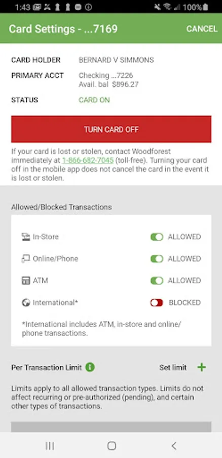 • MANAGE DEBIT CARDS – Turn your debit cards on/off, restrict transaction types, and set transaction type limits.