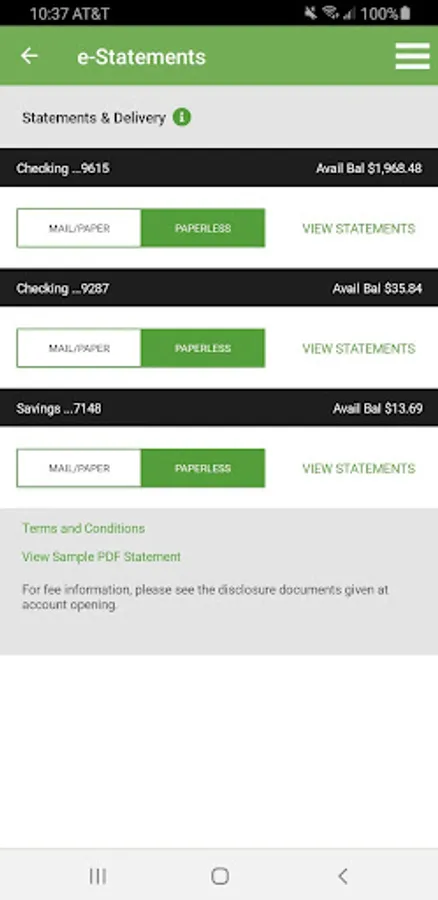 • STATEMENTS – View your bank statements in the app and sign up for paperless E-Statements.