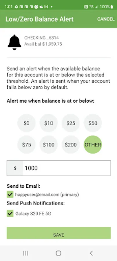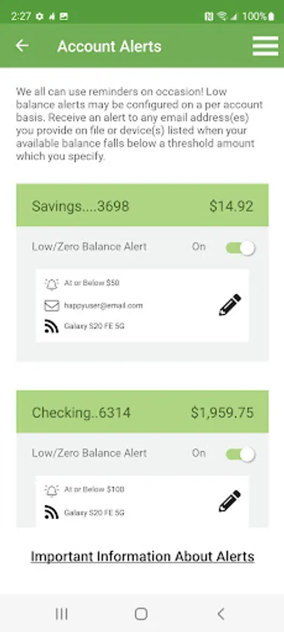 • ACCOUNT ALERTS – Stay up to date on your account balances by setting up Low Balance Alerts right in the app and start receiving alerts via email or push notification.
