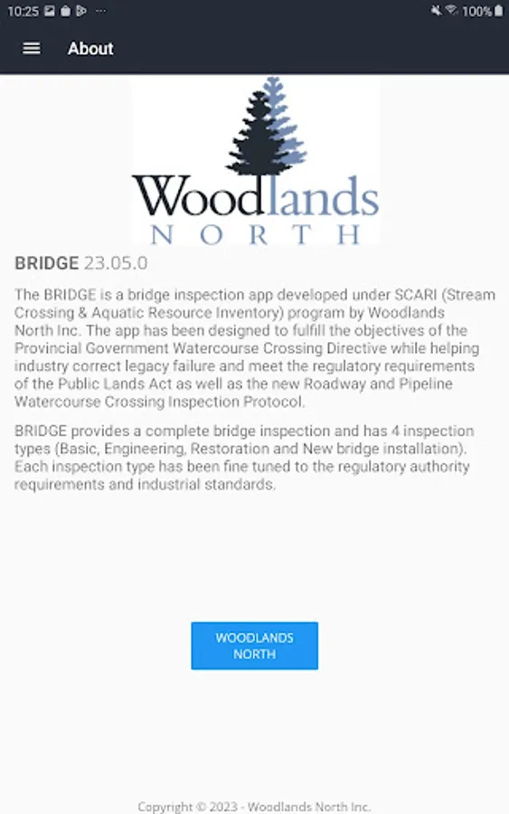 The BRIDGE is a bridge inspection app developed under SCARI (Stream Crossing a& Aquatic Resource Inventory) program by Woodlands North Inc. The app has been designed to fulfill the objectives of the Provincial Government Watercourse Crossing Directive while helping industry correct legacy failure and meet the regulatory requirements of the Public Lands Act as well as the new Roadway and Pipeline Watercourse Crossing Inspection Protocol.