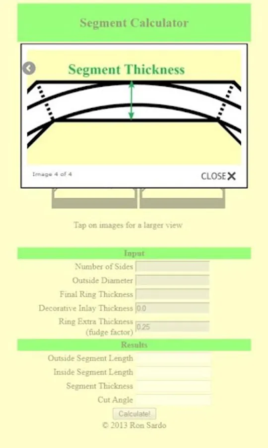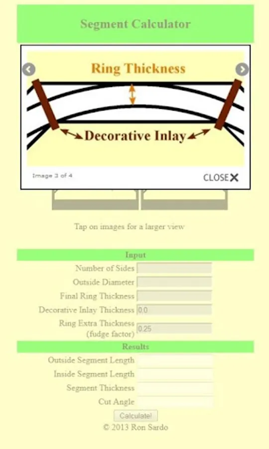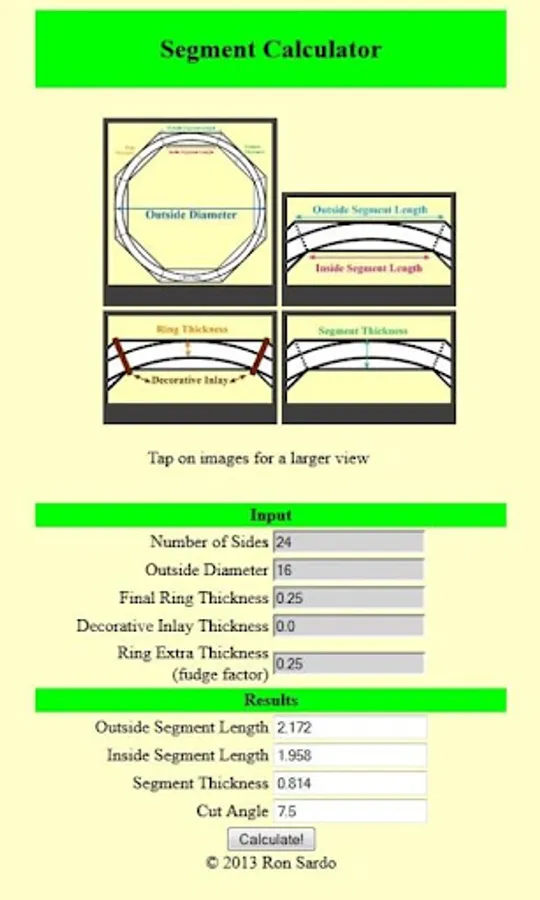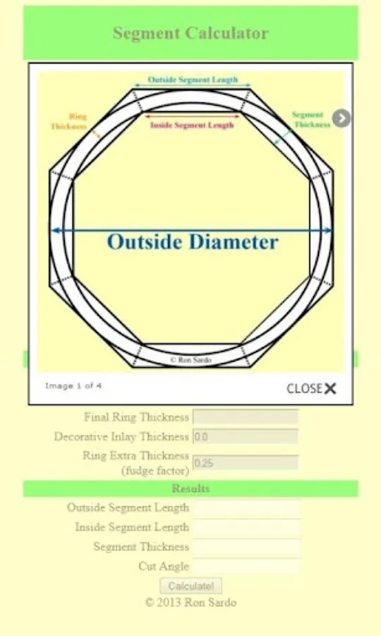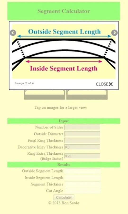 Our Segment Calculator can be used to find the size and angle of each segment in a ring. Also included is a feature to add a decorative inlay into your woodturning project. This calculator can be used to build plan sides for a 6+ sided picnic table, an arch way or anything that has 3 or more sides. Segmented Woodturning App.