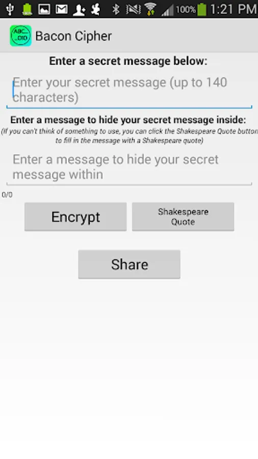 Here's a fun app to create and decode Bacon's Ciphers. You can hide a secret message inside a plain text, human-readable message by using capital and lower case letters. Enter your secret message, add a message to hide it in and 'encrypt' then you can share it with others.