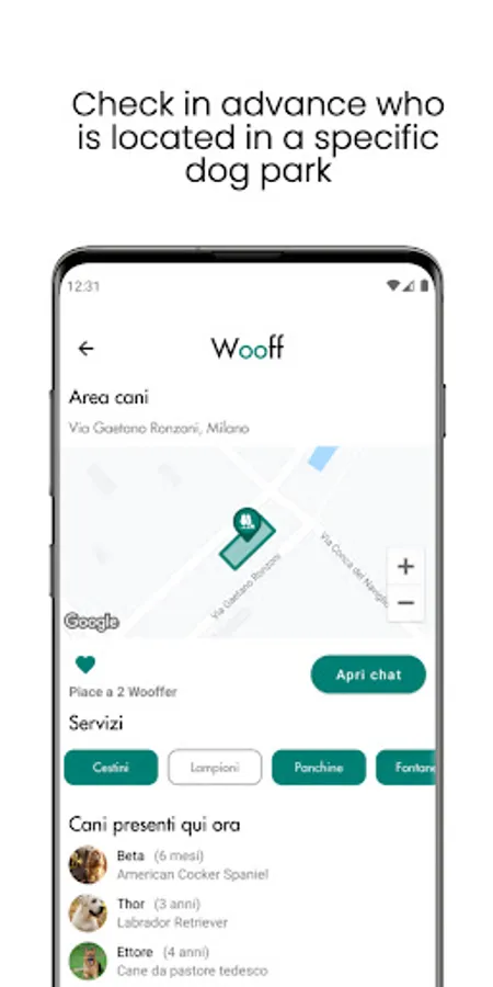 Thanks to the Check-in feature, with Wooff you will always be able to know in real-time which dogs are present in the dog parks around you, so you can select the most appropriate one for your four-legged friend!