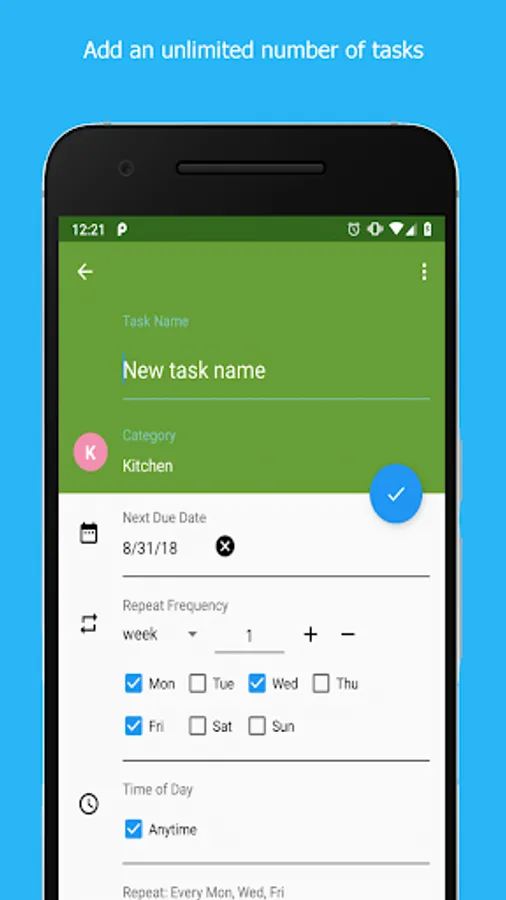 5. Add Repeat frequency. “No repeat” if it’s a one time task or select the repeat frequency. (For example: Repeat every 2 days)