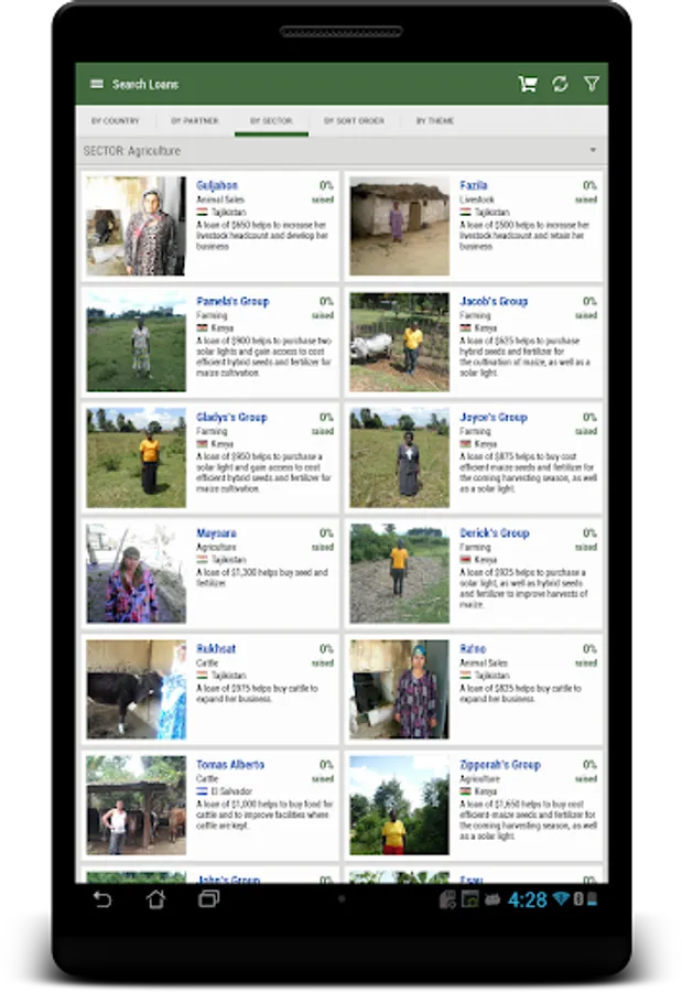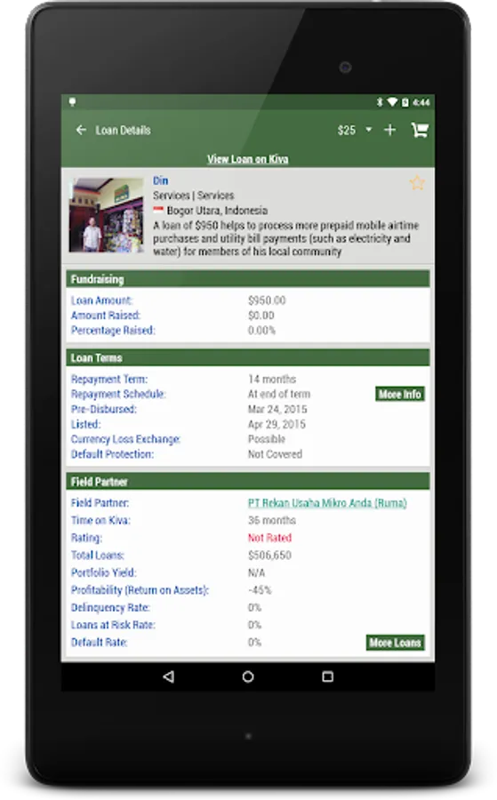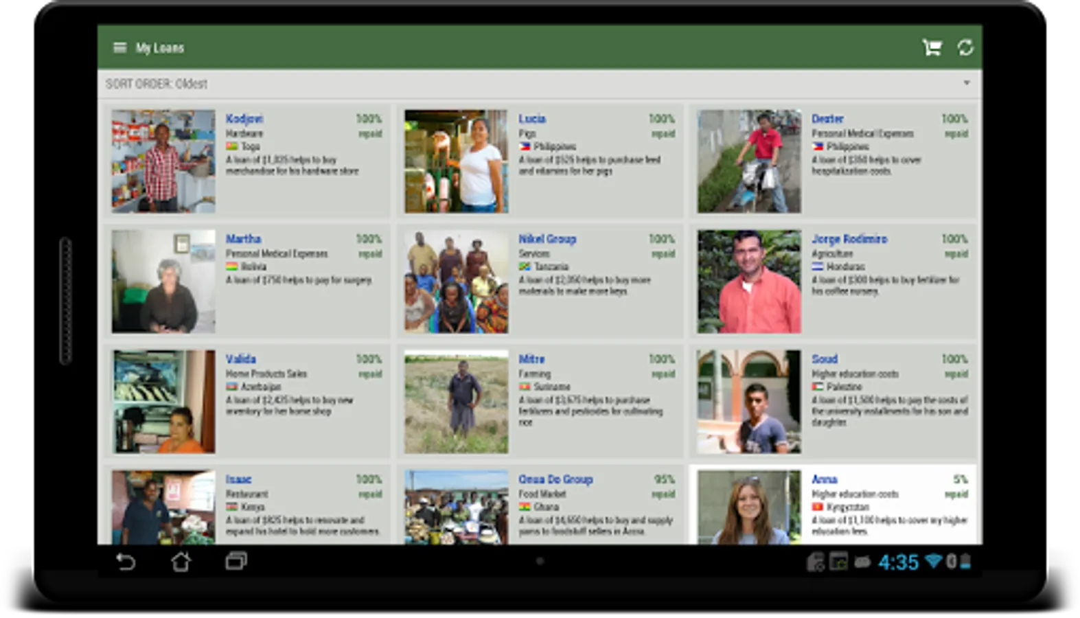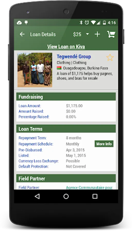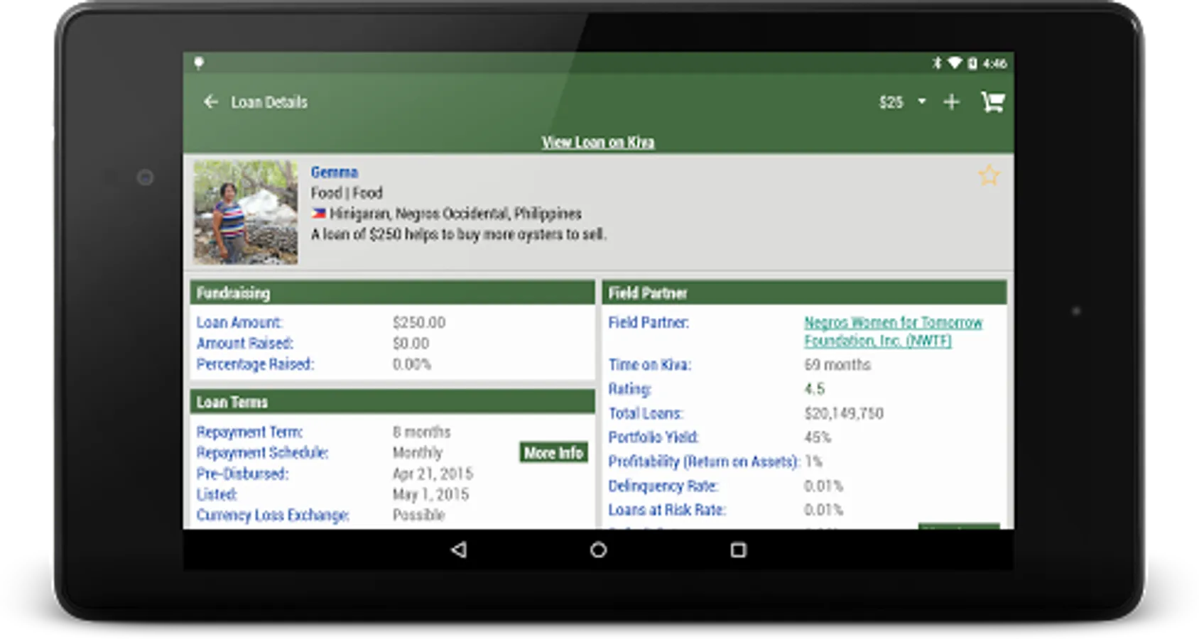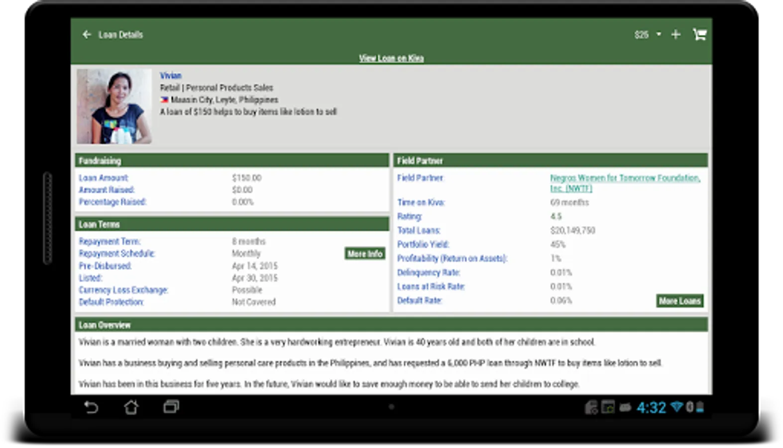 Loan Detail - show the Kiva loan details, has a link to view the loan on the Kiva website (http://www.kiva.org).