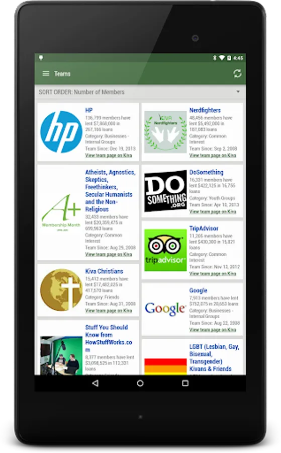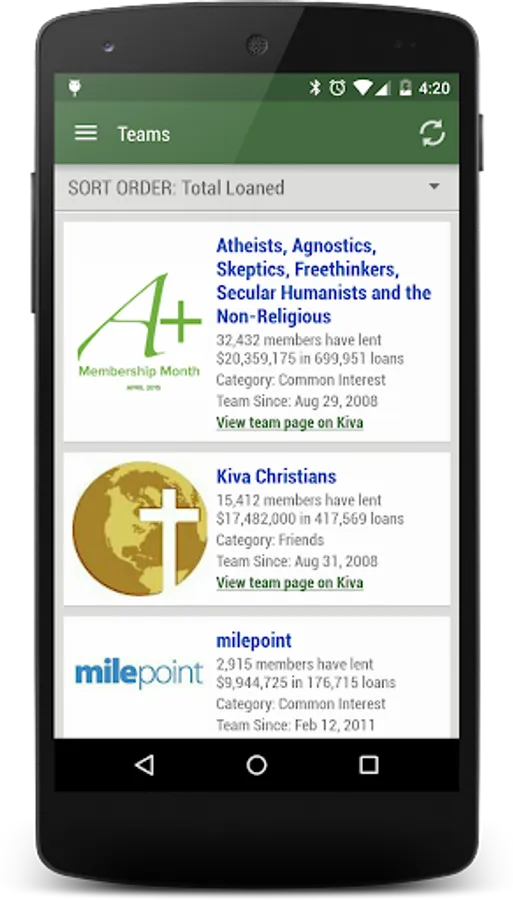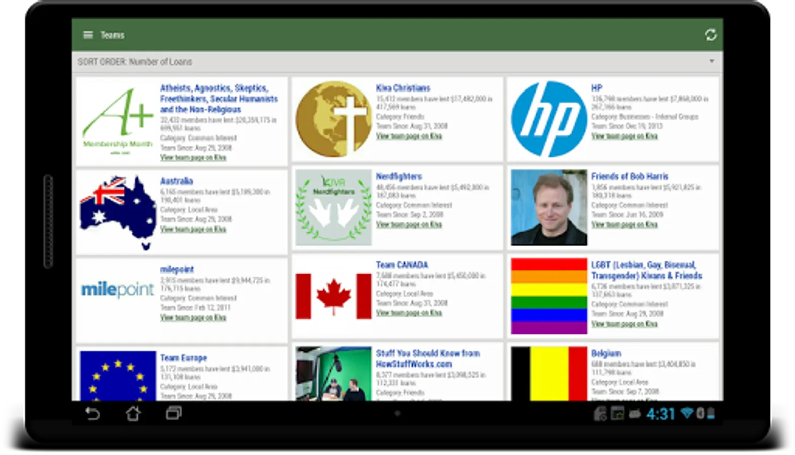 Teams - search for new teams to join, has a link to each of the Kiva teams page.