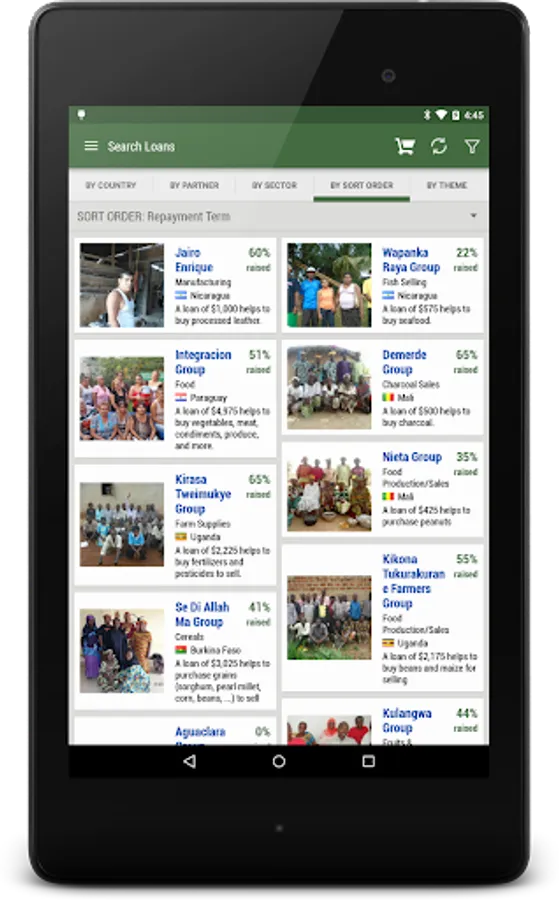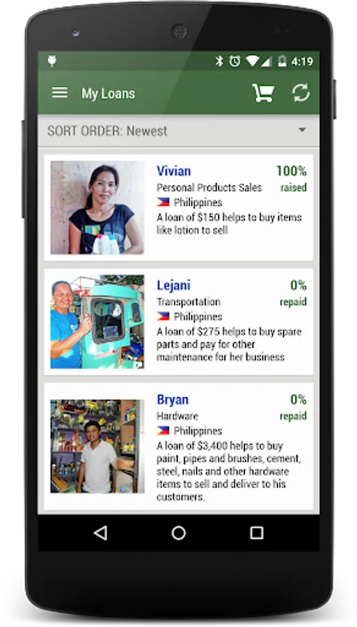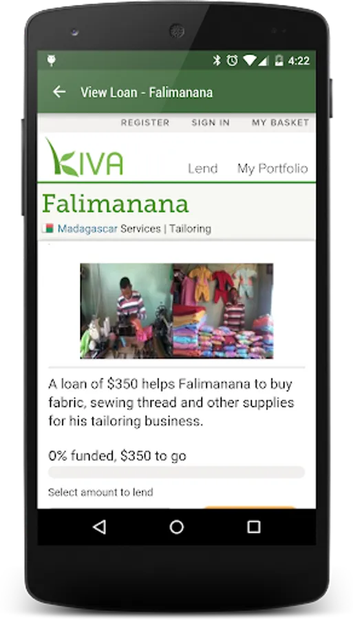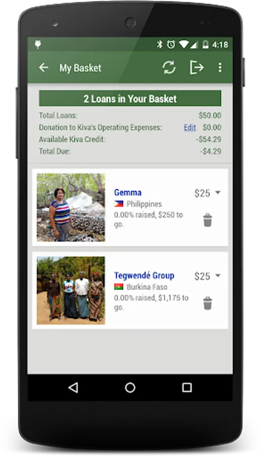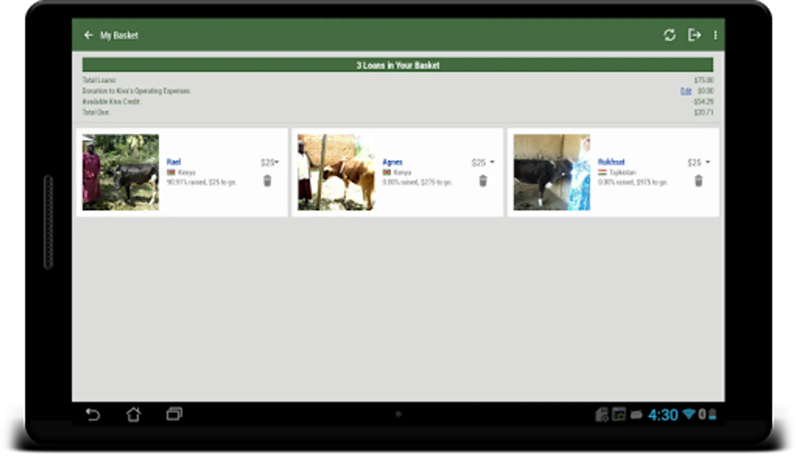 My Basket - manage your basket and checkout via the Kiva website from within the app.