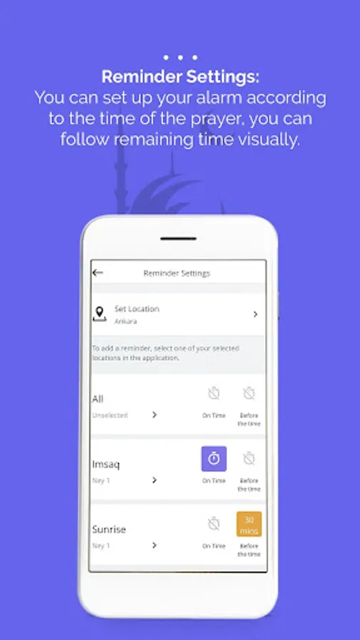 Reminder Settings: You can set up your alarm according to the time of the prayer, you can follow remaining time visually.