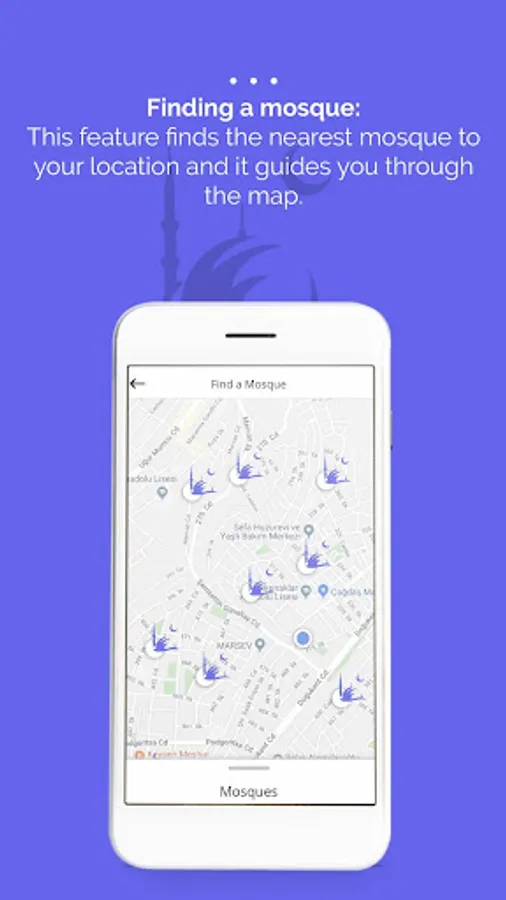 Finding a mosque: This feature finds the nearest mosque to your location and it guides you through the map.