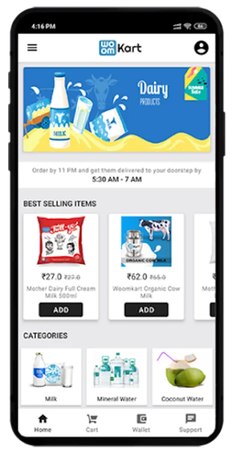 Woomkart is working on a great and social concept to deliver daily use products and mineral water bottles at your home. Woom represents water & milk on order, that’s how the innovation of Woomkart comes out. It's the finest delivery services with no extra delivery charges. Woomkart is working dedicatedly to deliver organic cow & buffalo milk and mineral water bottles up to 20 ltr to households, offices, hospitals, colleges, schools, and corporate daily from 6 am to 10 pm. The current services are running in Faridabad, Haryana India.