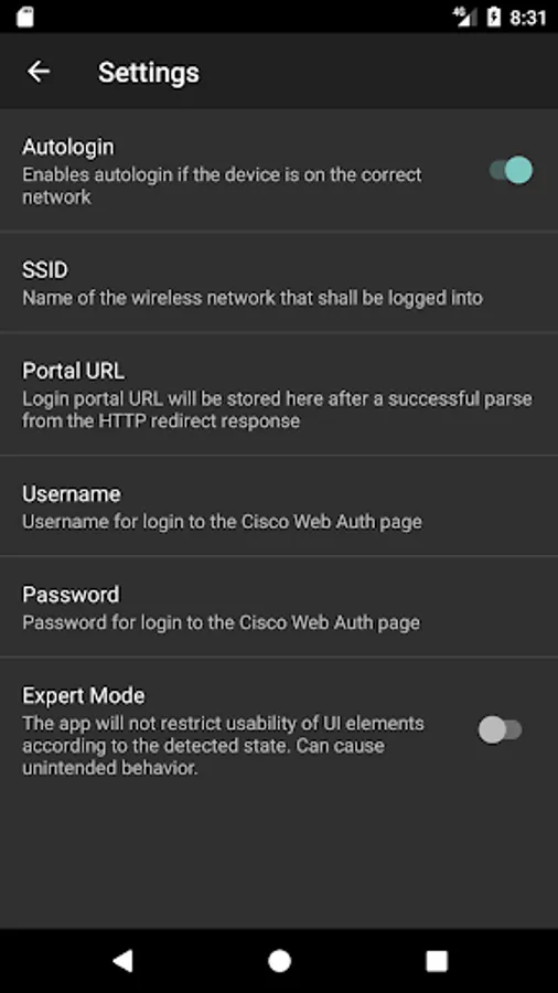 This app simplifies and automates the login process on the Cisco Web Auth captive portal that is used on some WiFi networks. The app detects changes of the network connectivity and resolves the captive portal redirection on a selected WiFi network with an automatic login function.