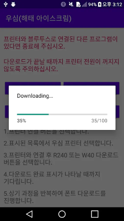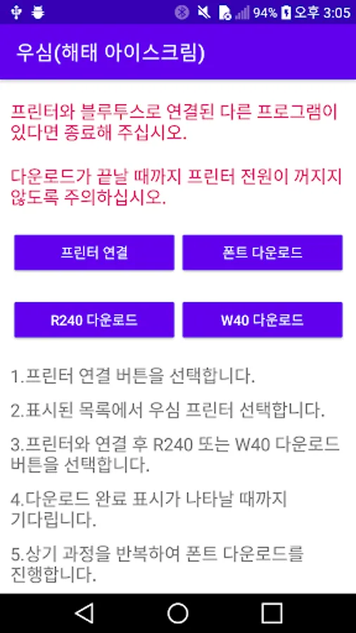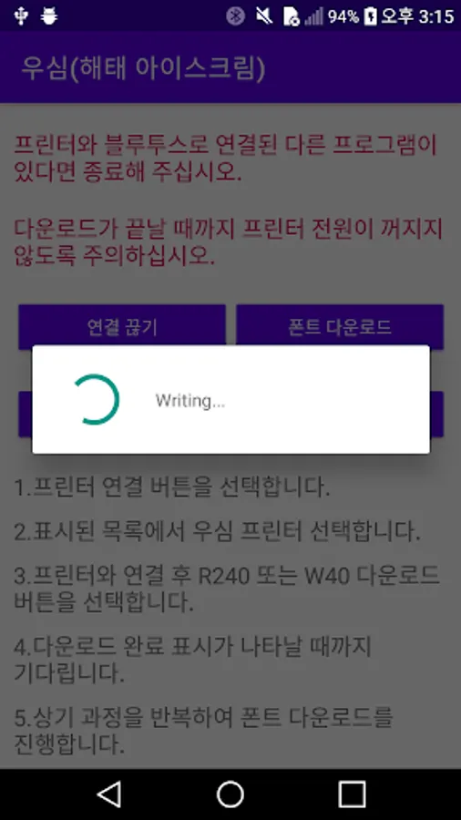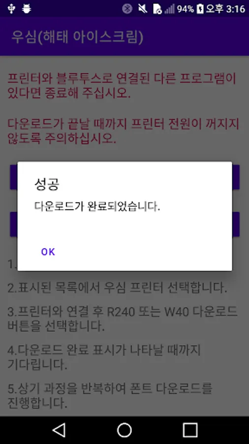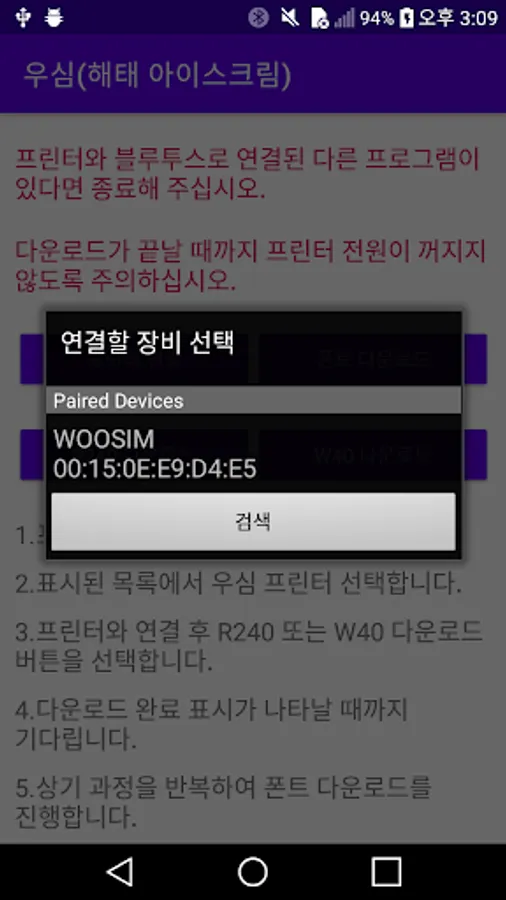An app that allows you to download modified firmware and font files so that Hangeul 'Byeon' letters can be printed on Woosim printers W40 and R240 provided to HAITAI Ice Cream.