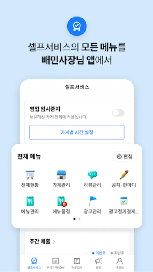 - Try all the menus of self-service in the Baemin boss app. Menu management, temporary suspension
