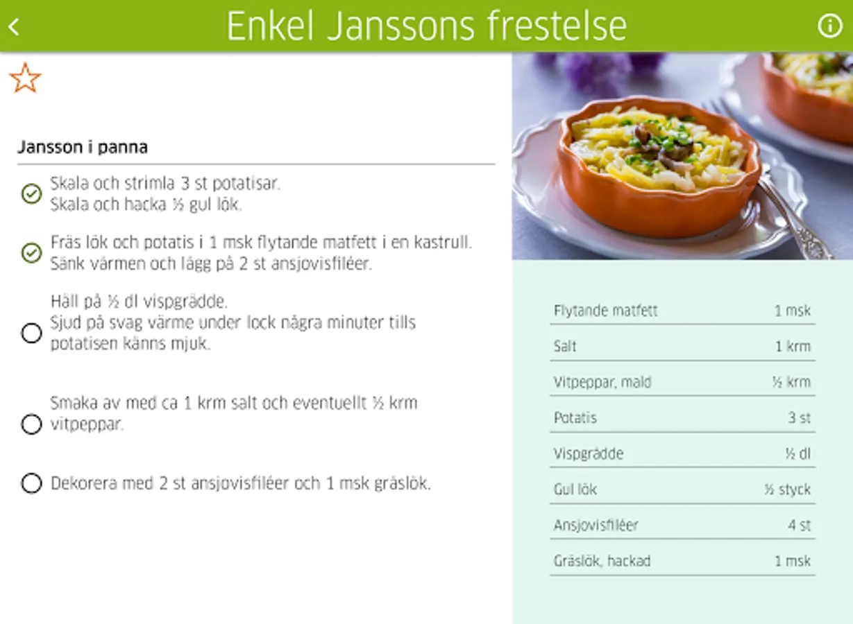 MatFröjd is an easily accessible and educational recipe application for the elderly themselves and their relatives / volunteers but also for home care staff. MatFröjd provides inspiration for planning and creating meals, so that both meal situation and quality of life are positively affected. The aim is to increase the quality of life of the elderly and strengthen their health as well as maintain or increase their physical functions and mental and social well-being. The MatFröjd app provides inspiration through wonderful, appetizing images that give appetite and food joy. The recipes are easy to follow with step-by-step instructions. In addition, MatFröjd provides a tool for selecting, purchasing and preparing food with regard to quality and health. The recipes are easy and understandable, even by older people / relatives / volunteers / staff with Swedish as a second language. MatFröjd contains recipes for breakfasts, snacks, appetizers, lunches / dinners, evening meals, drinks, bedside menu, flavor enhancers, leftovers and more. There are also recipes that suit the elderly with different cultural backgrounds. The recipes in the MatFröjd app are adapted to the specific needs of the elderly with tips for adaptations in terms of energy, enrichment, special diets etc. The MatFröjd app contains over 100 recipes. MatFröjd has been developed in close collaboration with reference and test groups, and the target group has had a great deal of influence over the end result. Hushållningssällskapet Västra is primarily responsible for the app TAKK-för-maten, but has been produced and developed in collaboration with several actors such as Alingsås, Kungälvs, Lidköping and Munkedal municipalities and the pensioners' associations SPF Seniorerna and Aktiva Seniorer. Behind technology and design are Wopii Development AB and Kom Design AB. The recipe app MatFröjd is financed by Allmänna Arvsfonden.