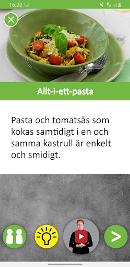 TAKK-för-maten is a recipe app that uses images, video sequences, text, speech and characters to show how to cook food. The app TAKK-för-maten is unique of its kind and the first digital recipe book with both pictures, videos, speech and TAKK (signs as supplementary communication).