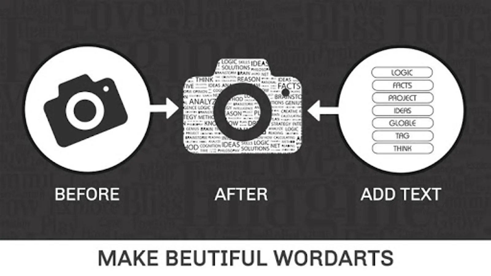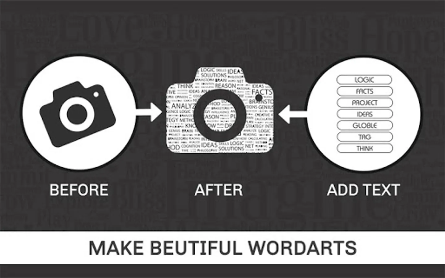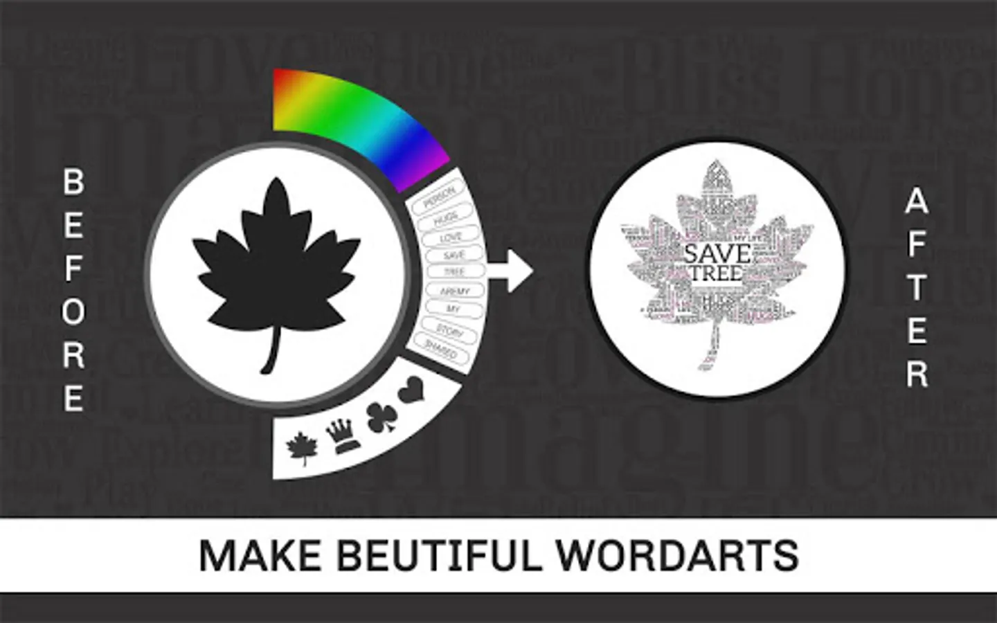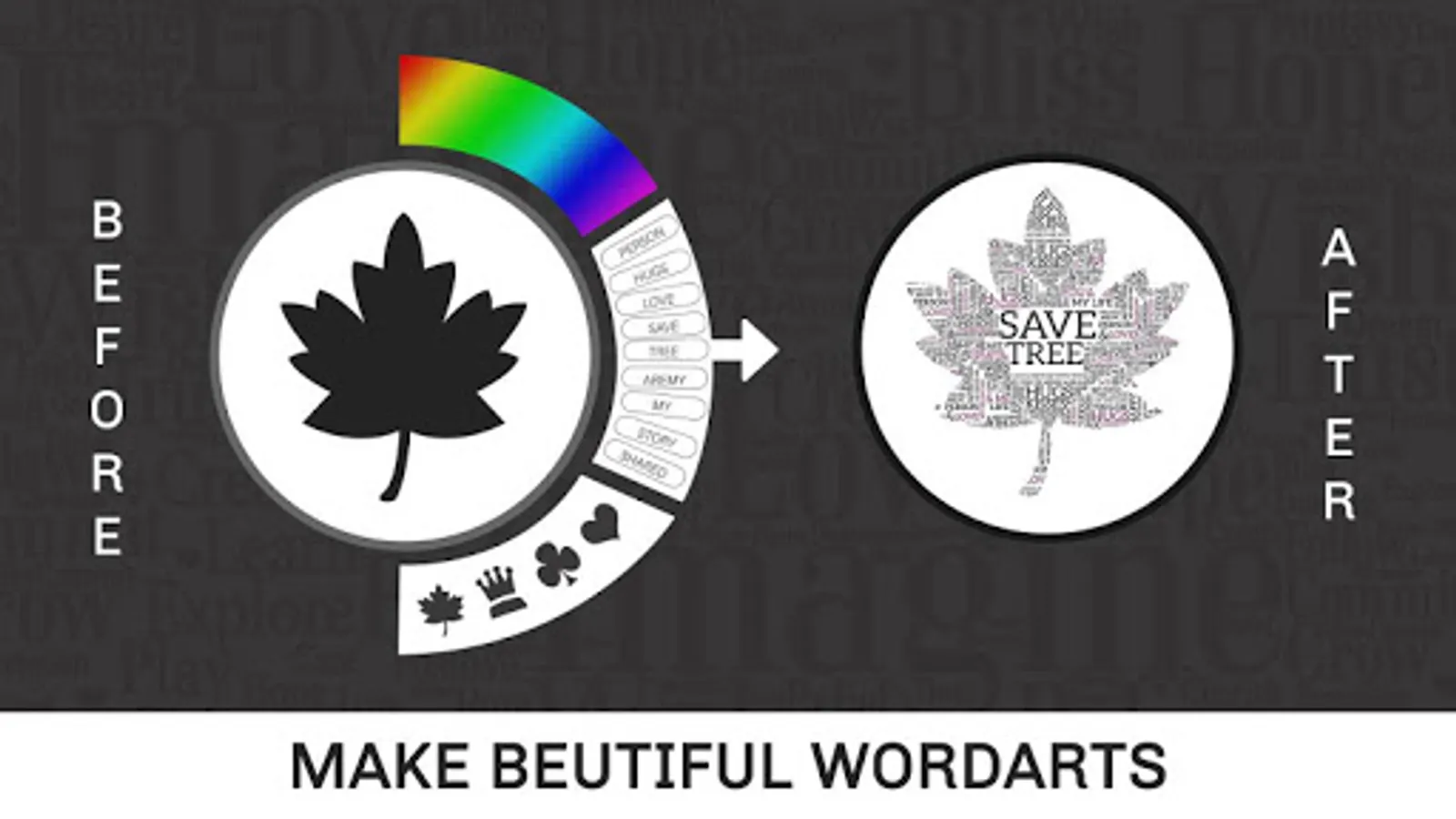 Word Art Creator - Word Cloud Generator app is now made simple including a phonetic word art generator. It generates a word cloud with picked text for each word. It is efficient in picking the right color and font combination visibility of each word. Enter a few words, and the application will shuffle them around in a cutesy scattered fashion. Pick a color or few important words, shape them, export them, and use the picture. Clear it and repeat it. It provides a unique font style, and the best thing is that you can pick every one of them to create wonderful word art. This app enables you to create amazing and unique word cloud art with ease. This is the most stunning and creative photo editor to make your photos in art.