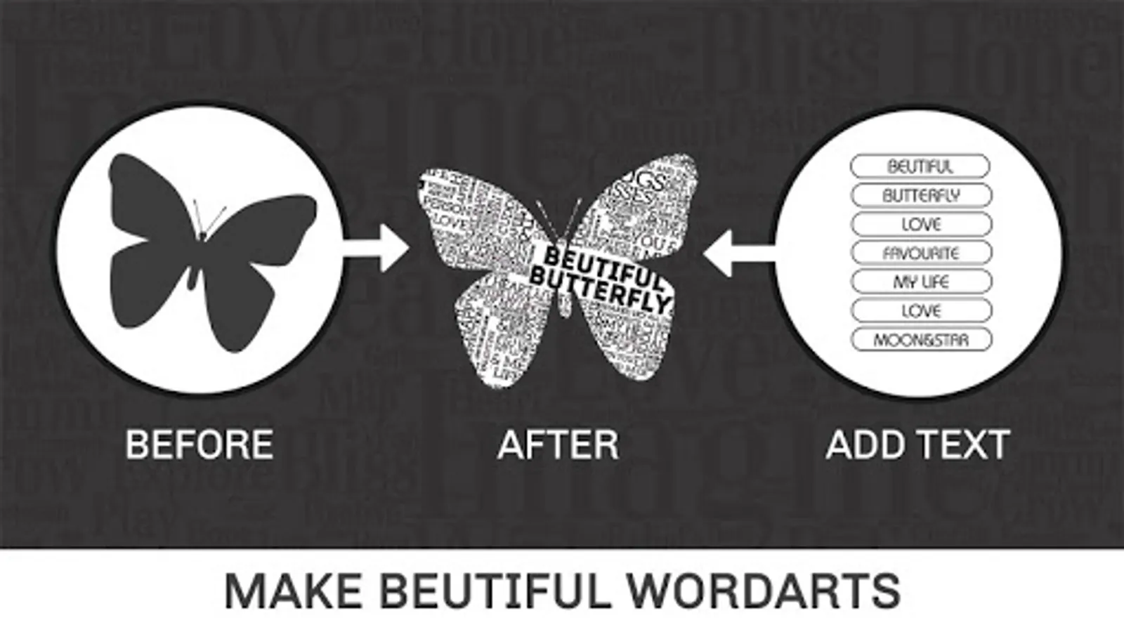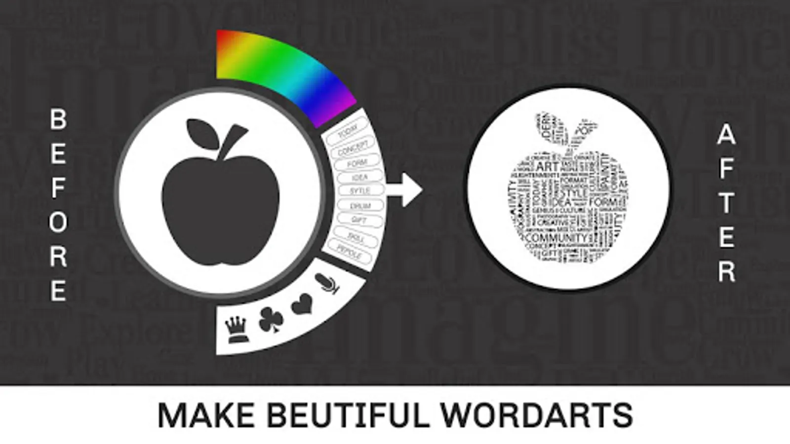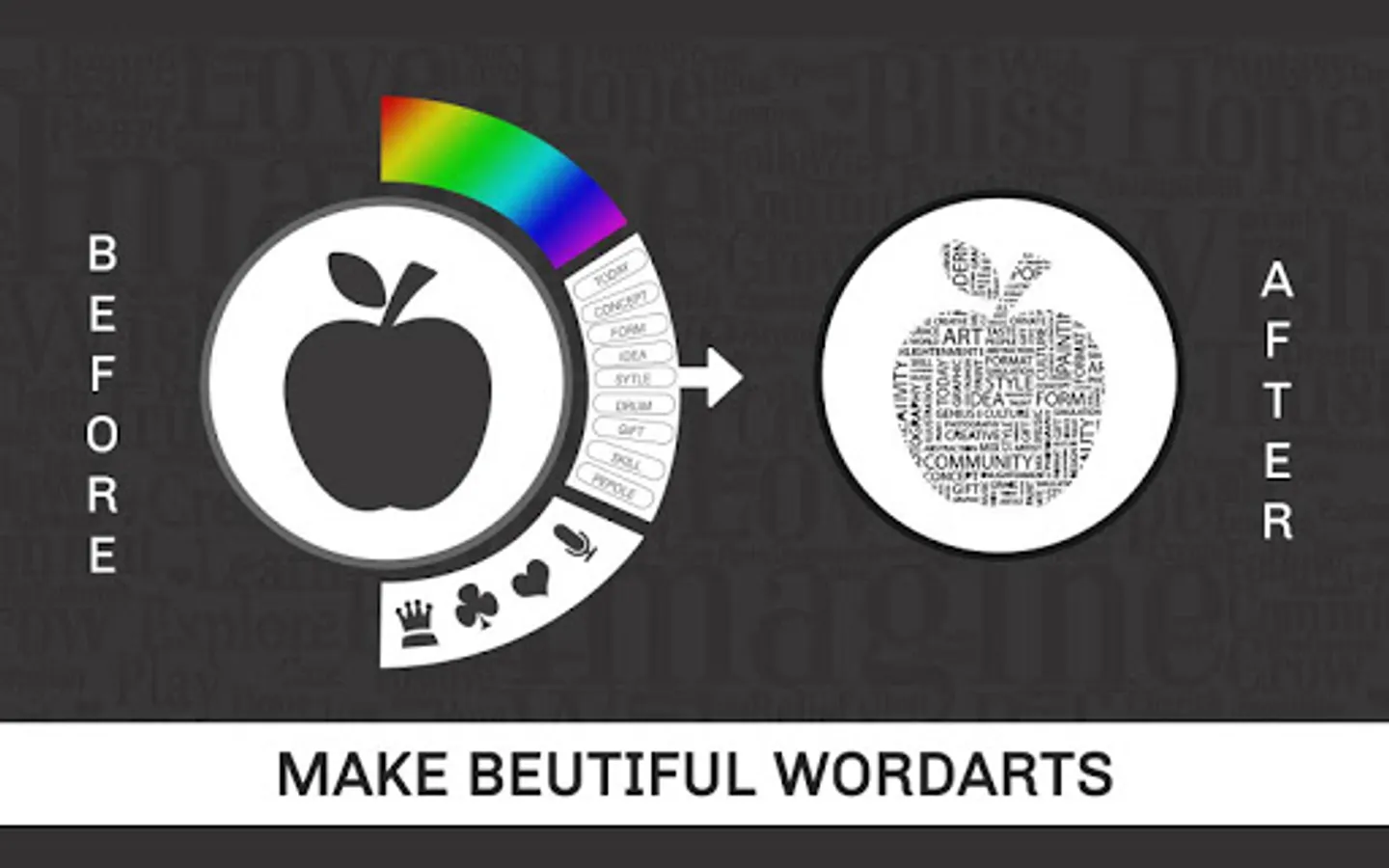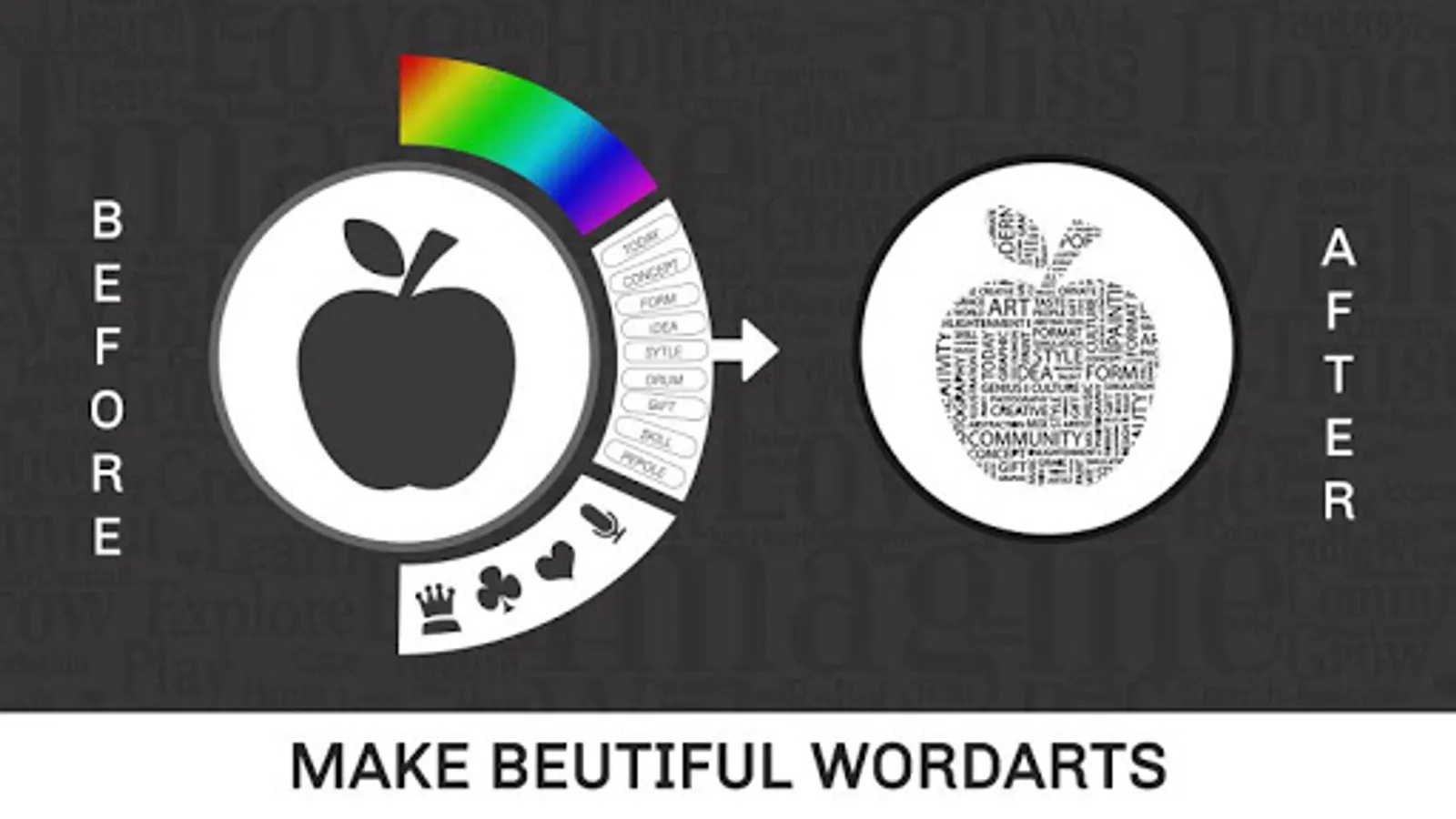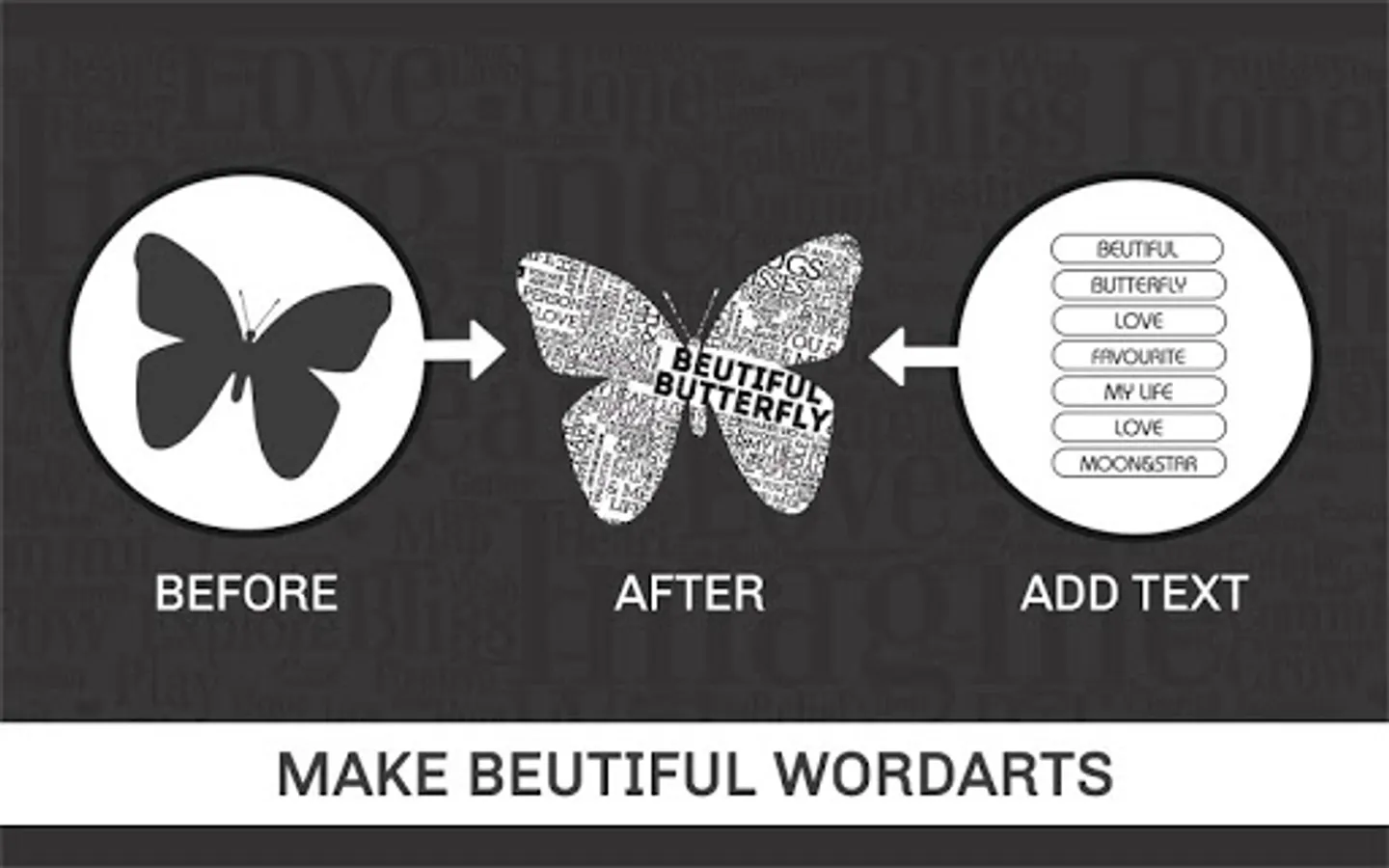 Word Art Creator - Word Cloud Generator app is now made simple including a phonetic word art generator. It generates a word cloud with picked text for each word. It is efficient in picking the right color and font combination visibility of each word. Enter a few words, and the application will shuffle them around in a cutesy scattered fashion. Pick a color or few important words, shape them, export them, and use the picture. Clear it and repeat it. It provides a unique font style, and the best thing is that you can pick every one of them to create wonderful word art. This app enables you to create amazing and unique word cloud art with ease. This is the most stunning and creative photo editor to make your photos in art.