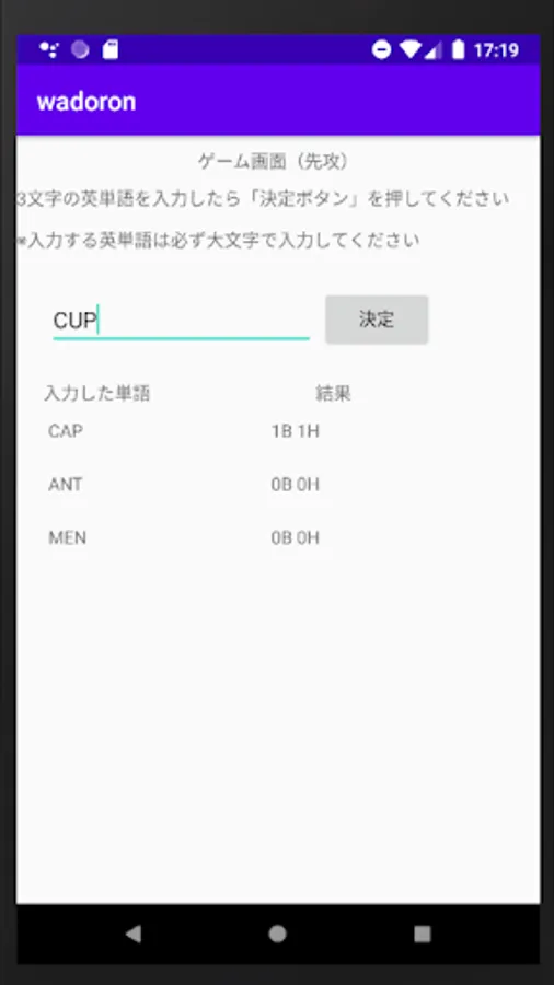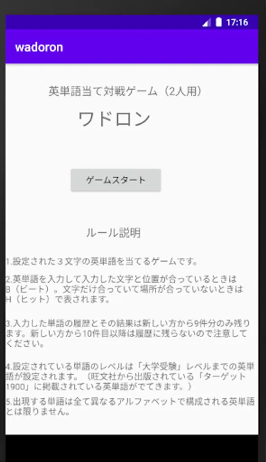 ヌメロンの英単語バージョンのゲームです。設定した3文字の英単語を先に当てたら勝ちというシンプルなゲームです。英単語のレベルは大学受験レベルの英単語が中心ですが、高校受験レベルの英単語もあります。ヌメロンが好きな人はきっと楽しめるのでぜひ遊んでみてください。(2人用ゲーム)