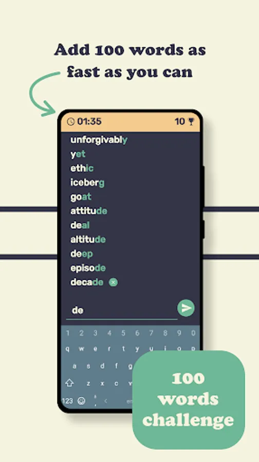 π― 100 words: Try to chain 100 words in a row as fast as you can and become the leader with the greatest minimal time!