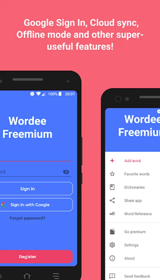 Other features include changing the dictionary of them, Google Sign-In, etc. All the words are saved on the cloud (powered by Google) so you can access them from a tablet, chrome book or other phones.