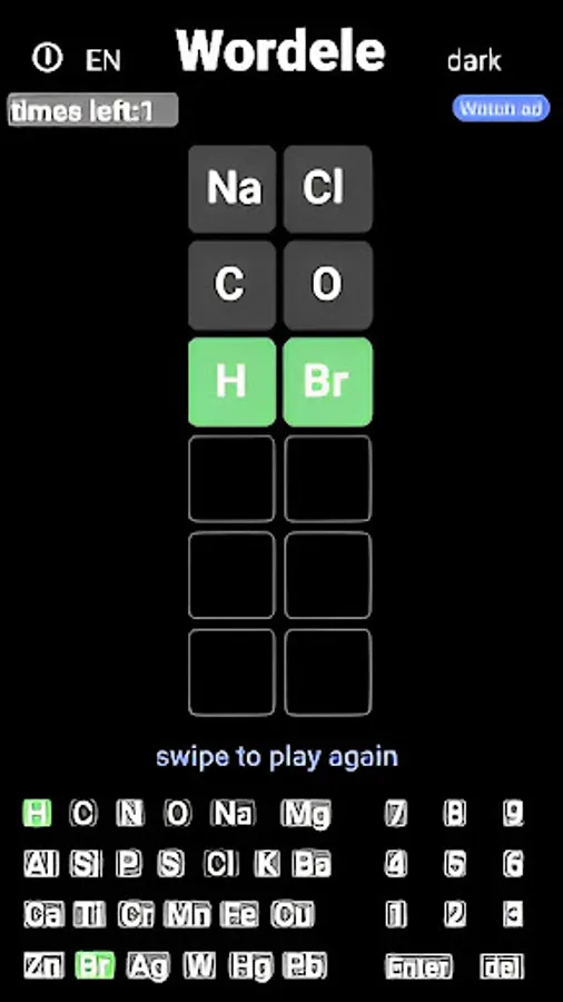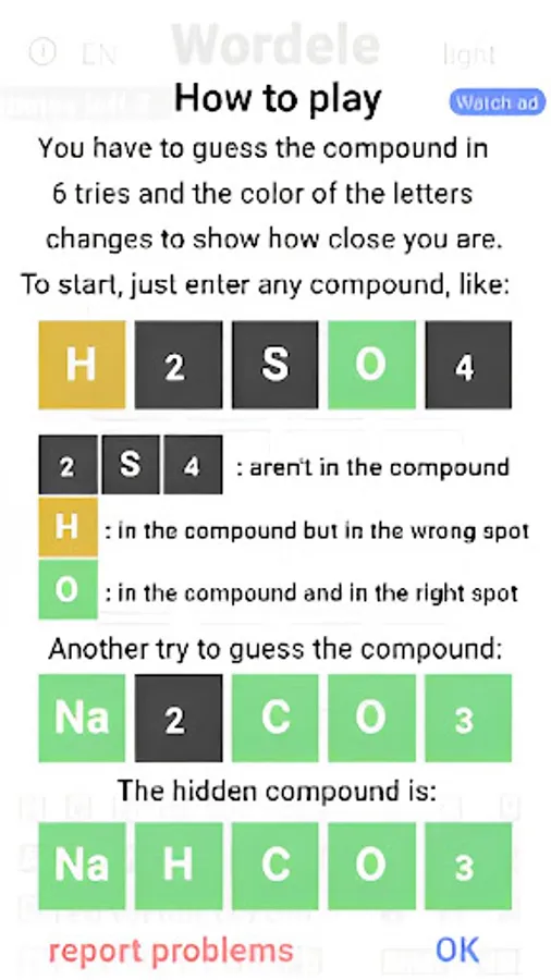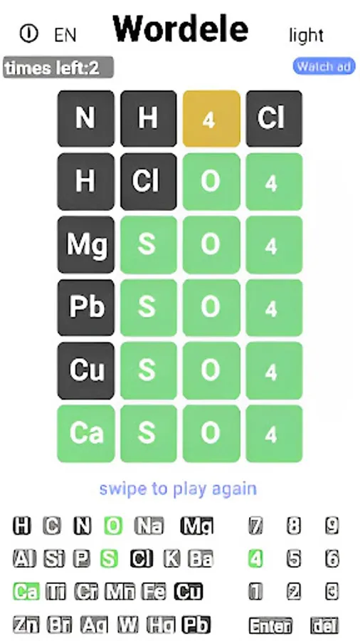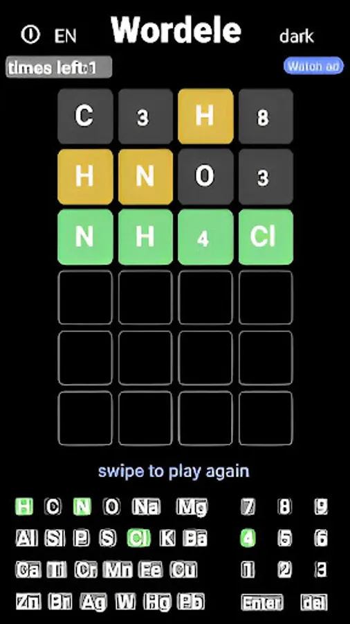 In Wordele, players have six attempts to guess a chemical compound, with feedback given for each guess in the form of colored tiles indicating when elements or number match or occupy the correct position.