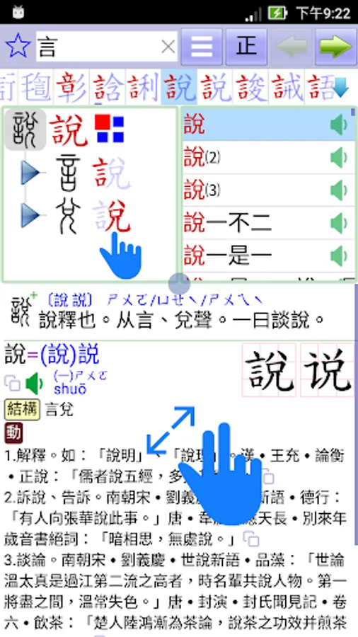 Use [Tree Structure] to analyze the glyph structure of individual characters in detail, and list [Xiaozhuan] and [Regular Script] at the same time for comparison. You can also open each layer to observe the position of radicals and analyze stroke changes, and relate to [Vocabulary List] , you can view related explanations with one [click] action, which saves the cumbersome query process and improves the efficiency of learning.