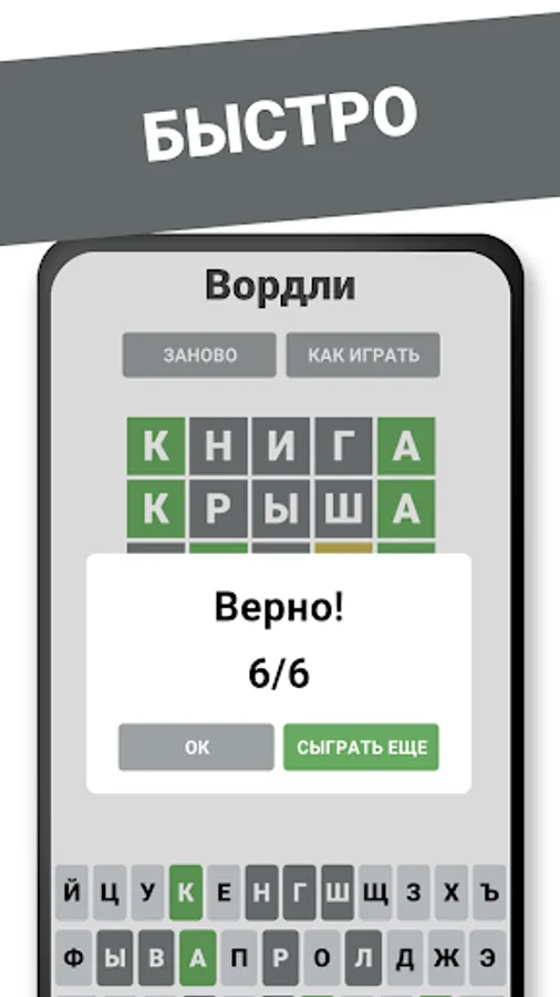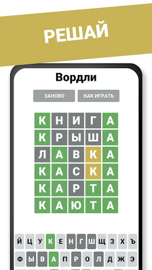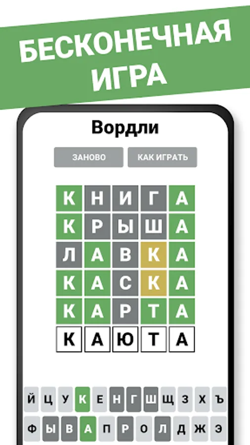 Играйте в популярную игру Вордли на русском языке! Количество игр не ограничено. Угадайте слово за наименьшее количество попыток!